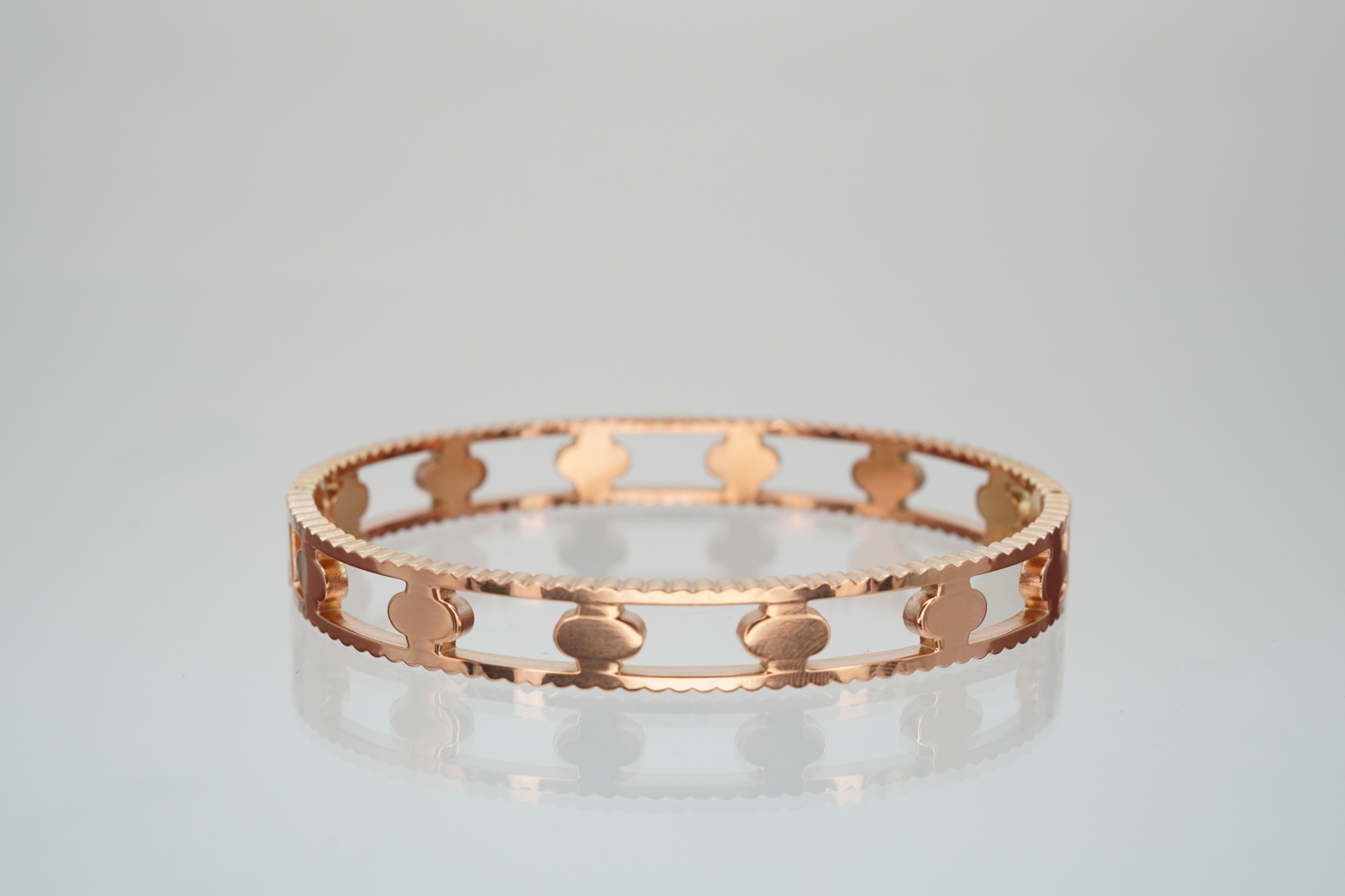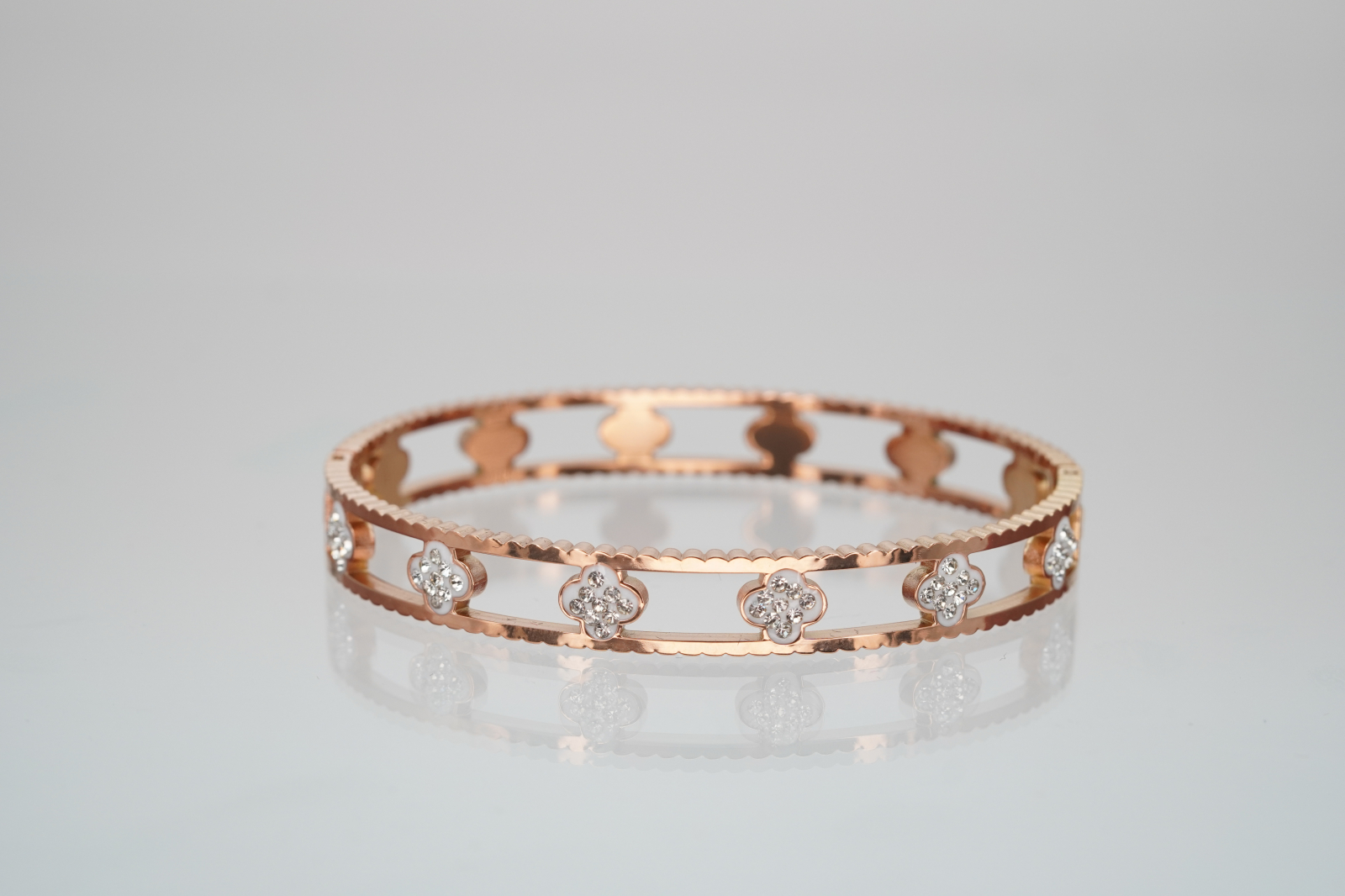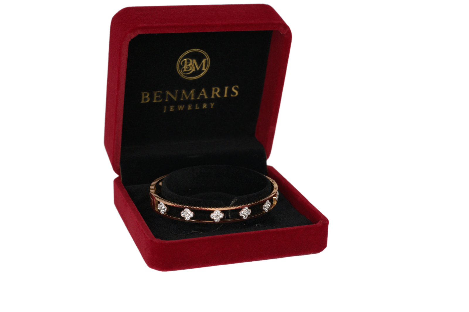 Brățară elegantă din oțel inoxidabil placată cu aur roz, cu un design sofisticat decupat și detalii florale încrustate cu cristale fine. Marginile texturate adaugă un plus de rafinament, oferind un efect vizual luxos și feminin. Această bijuterie combină eleganța clasică cu o notă modernă, fiind perfectă pentru ocazii speciale sau pentru a completa o ținută rafinată. Este livrată într-o cutie premium Benmaris Jewelry, ideală pentru cadou.
