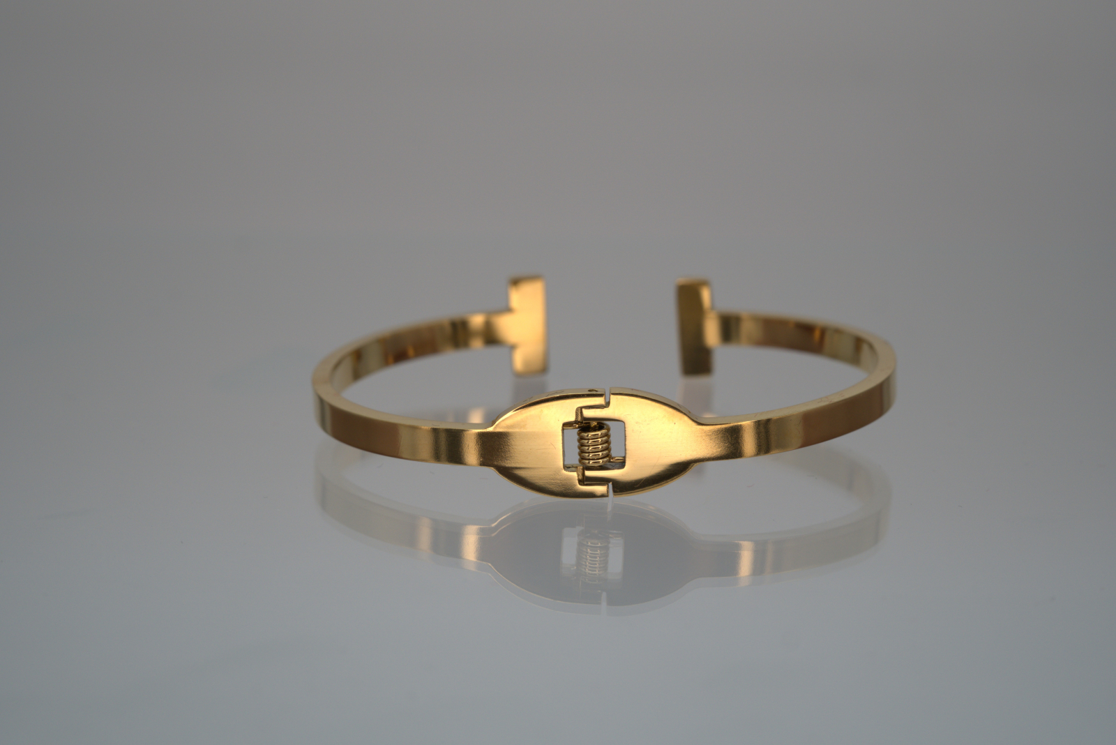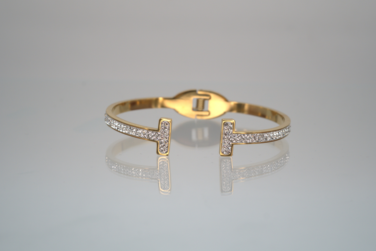 Brățară rafinată din oțel inoxidabil placată cu aur, cu un design elegant deschis și capete în formă de litera „T”, împodobite cu cristale strălucitoare. Liniile curate și aspectul modern o transformă într-o bijuterie ideală pentru femeia sofisticată, care apreciază echilibrul perfect între simplitate și lux. Finisajul de înaltă calitate garantează durabilitatea și strălucirea în timp. Produsul este livrat într-o cutie premium Benmaris Jewelry, perfectă pentru cadou.
