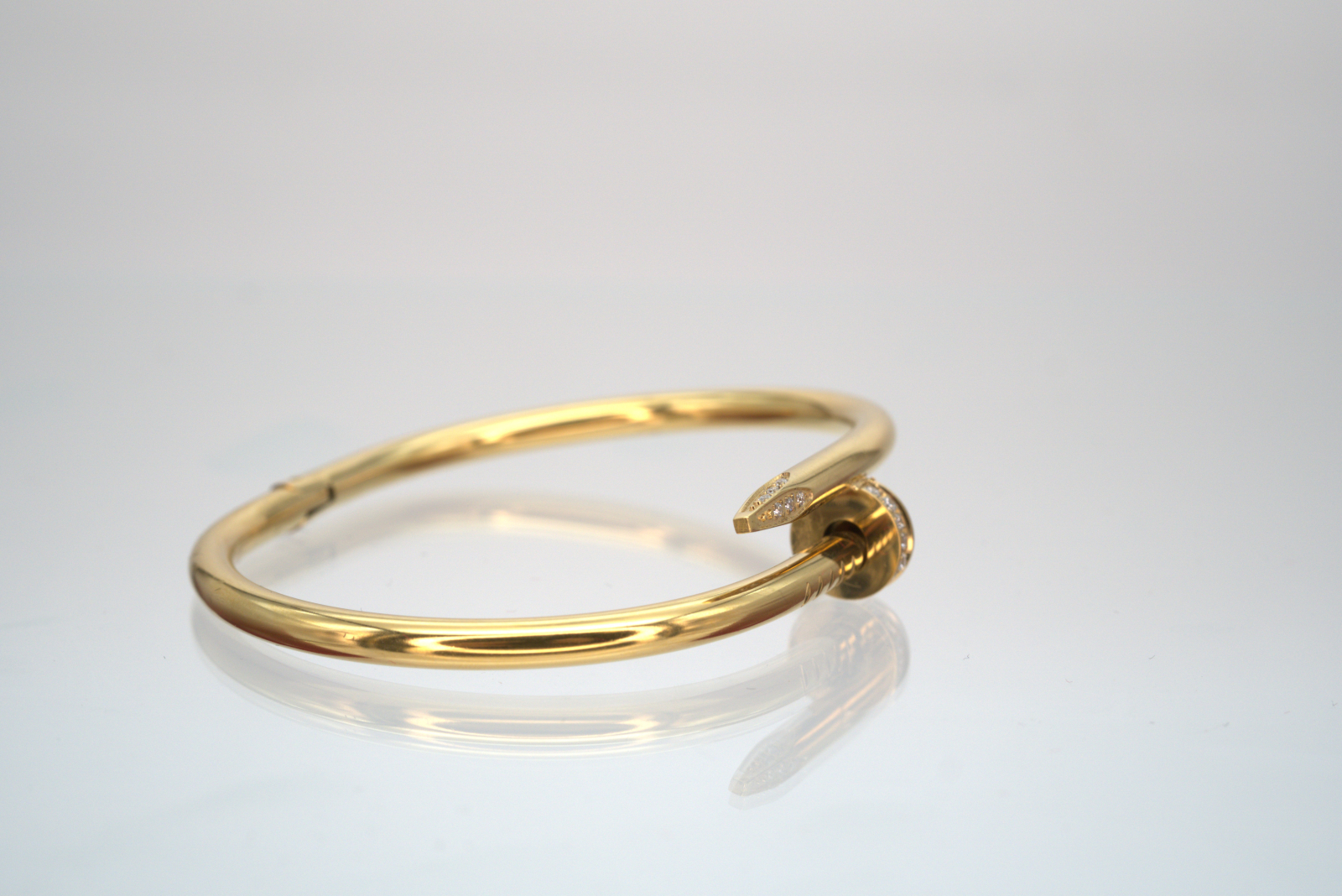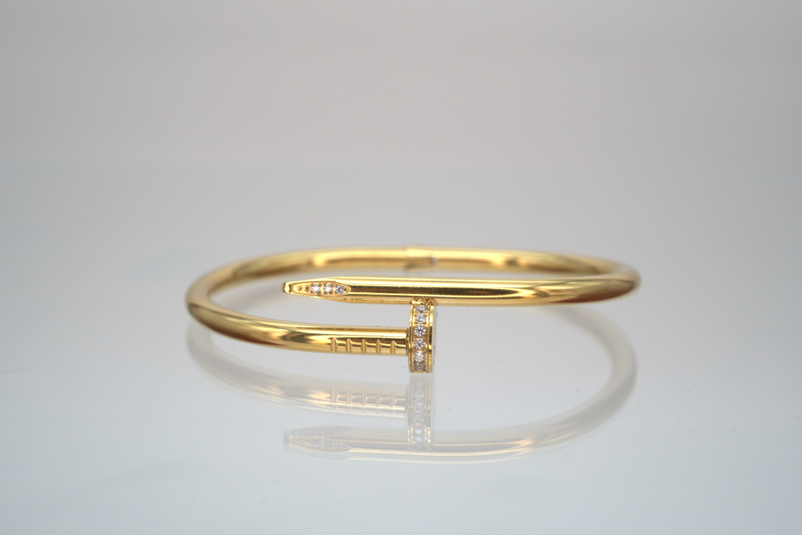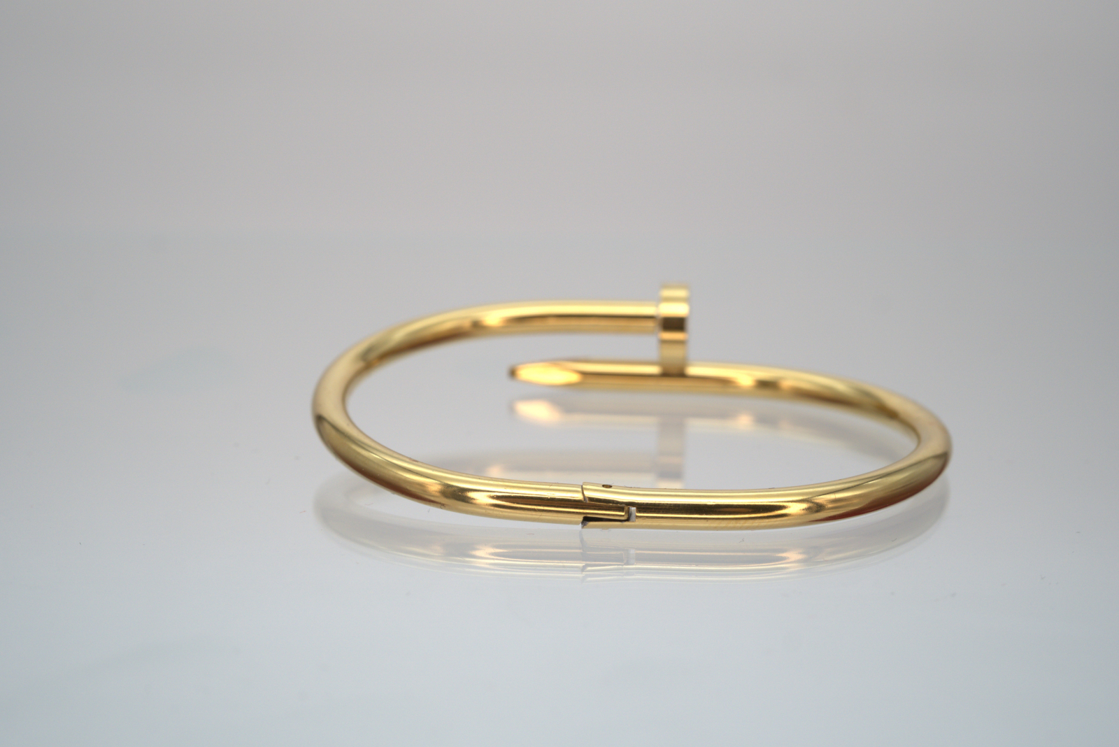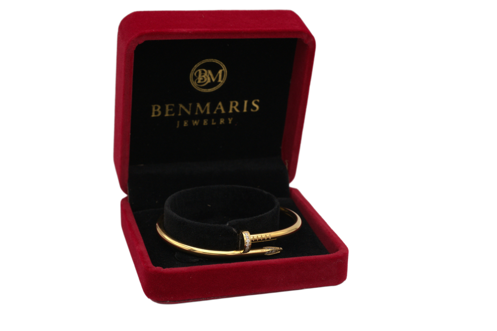Brățară elegantă din oțel inoxidabil placată cu aur, cu un design modern inspirat din forma unui cui îndoit, simbol al rezistenței și stilului îndrăzneț. Capătul brățării este decorat cu cristale fine, oferind o notă de rafinament și strălucire subtilă. Este o bijuterie versatilă, potrivită pentru orice ocazie, ce îmbină eleganța clasică cu un aer contemporan. Produsul este livrat într-o cutie de lux Benmaris Jewelry, ideală pentru a fi oferită cadou.