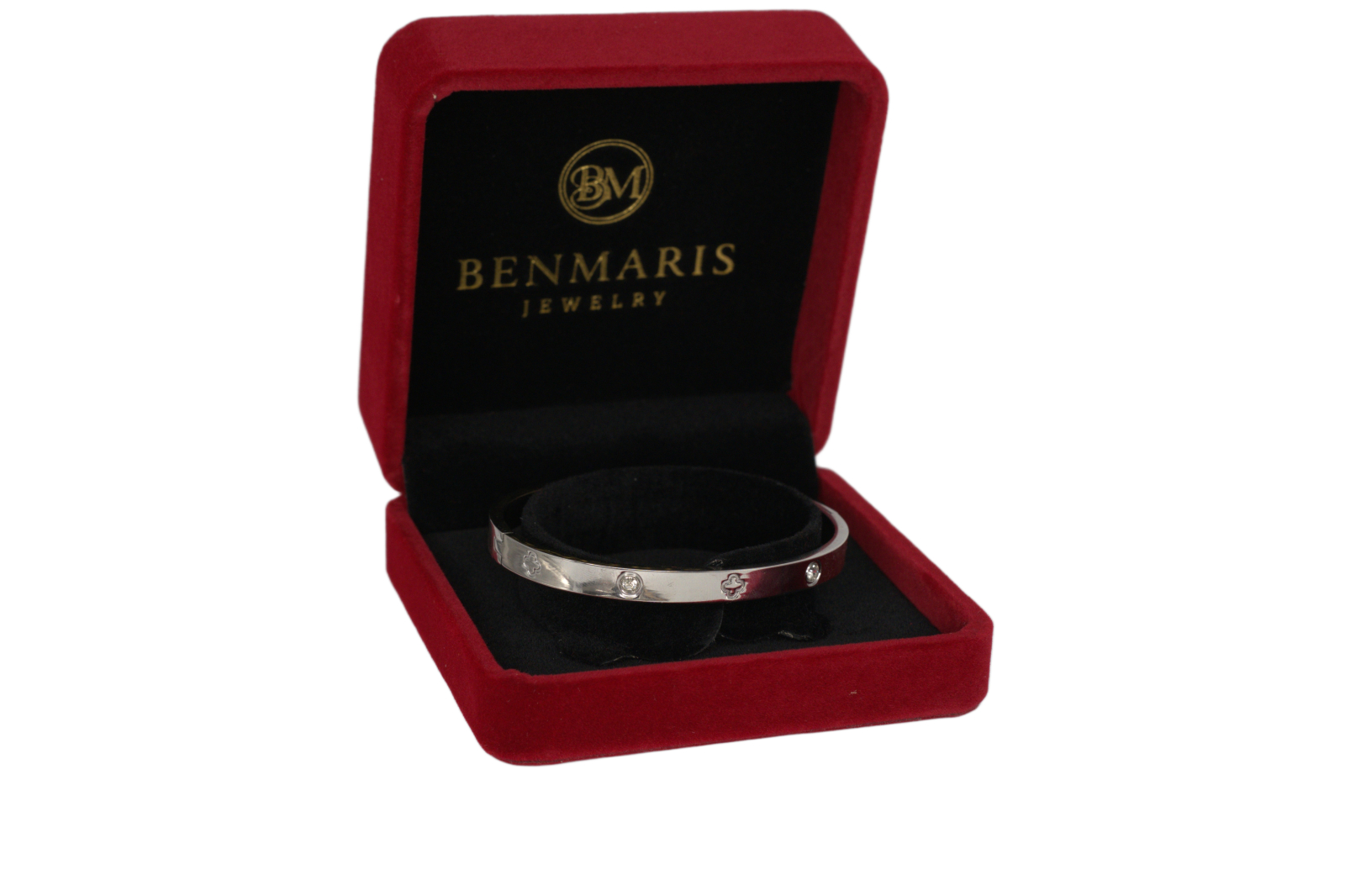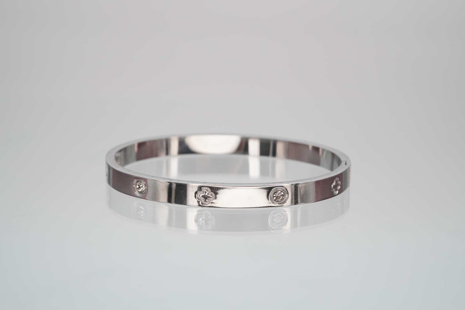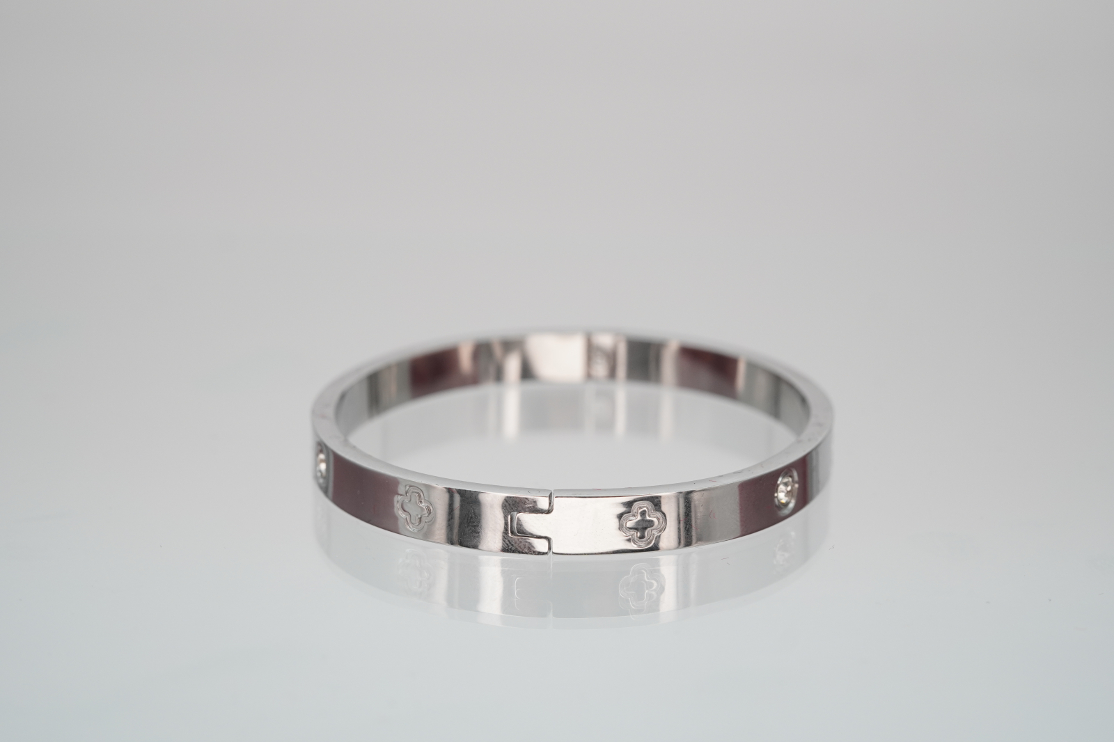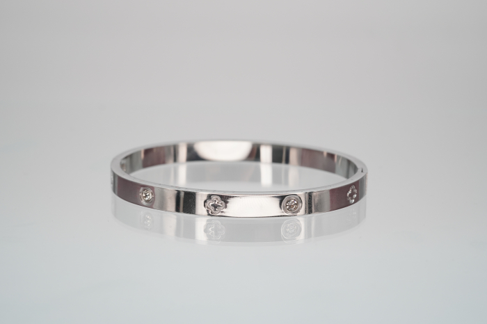 Brățară rigidă din oțel inoxidabil argintiu, cu finisaj lucios și detalii gravate în formă de trifoi, alternate cu cristale strălucitoare. Designul său elegant și rafinat o transformă într-un accesoriu versatil, perfect pentru a completa orice ținută – de la cea office la cea de seară. Fabricată din materiale durabile, rezistente la uzură și oxidare, brățara își păstrează strălucirea de-a lungul timpului. Se livrează într-o cutie elegantă Benmaris Jewelry, ideală pentru un cadou deosebit.