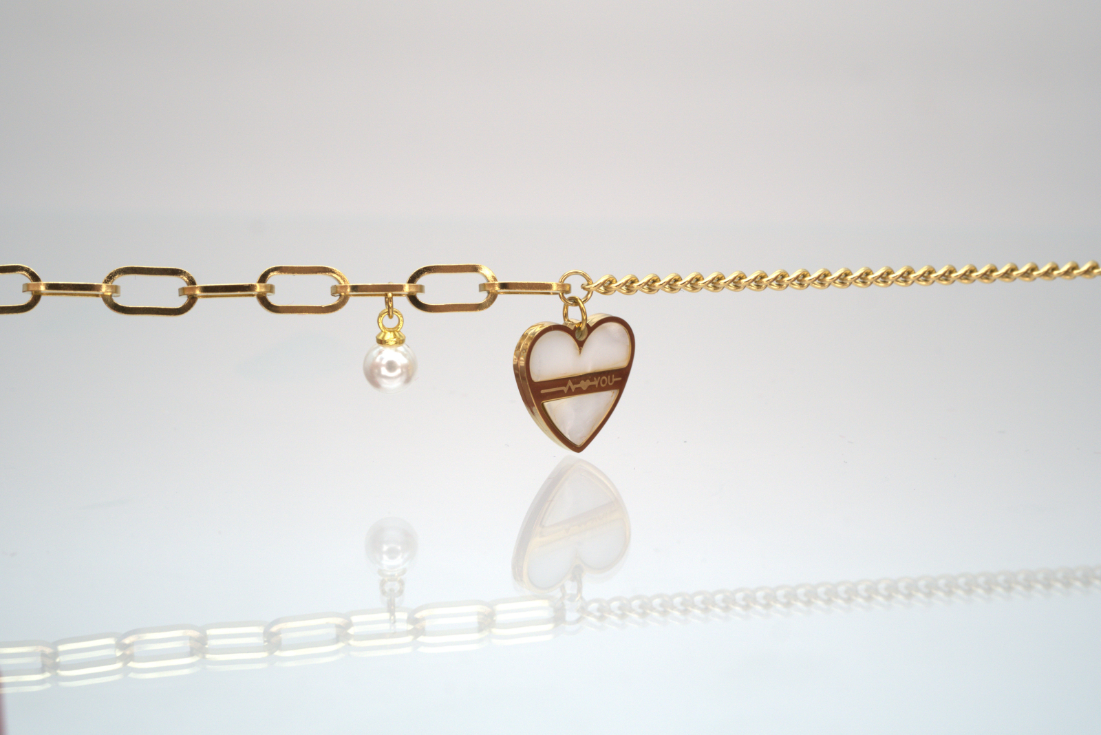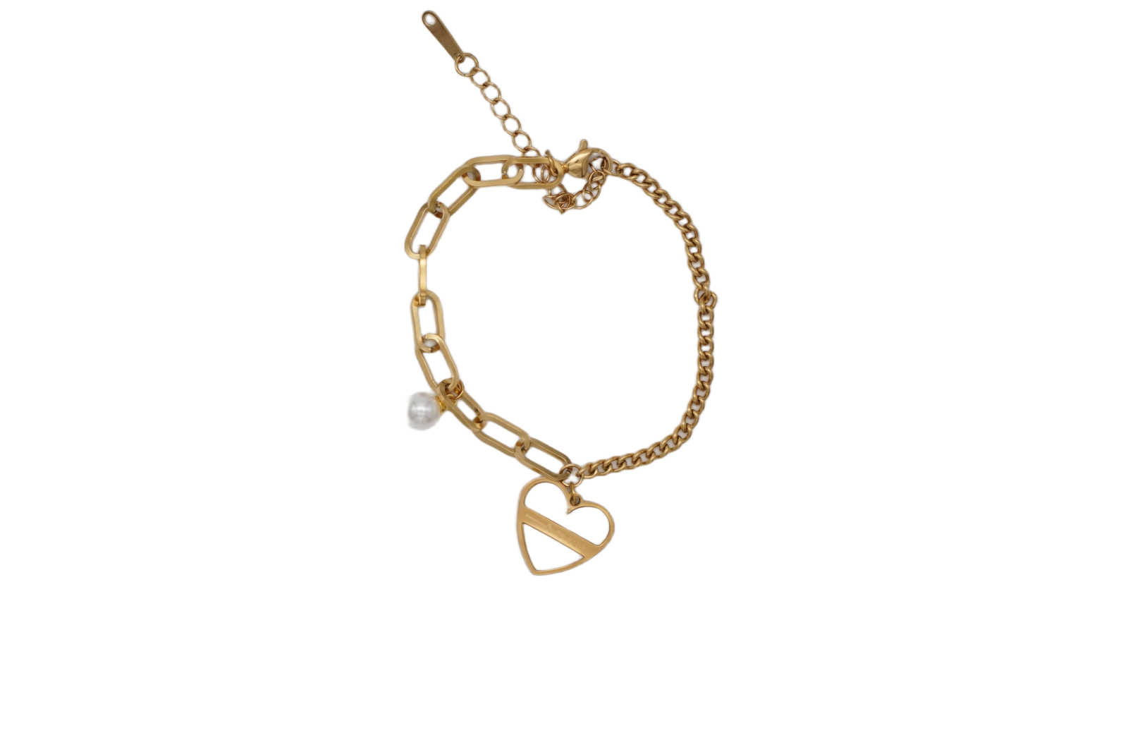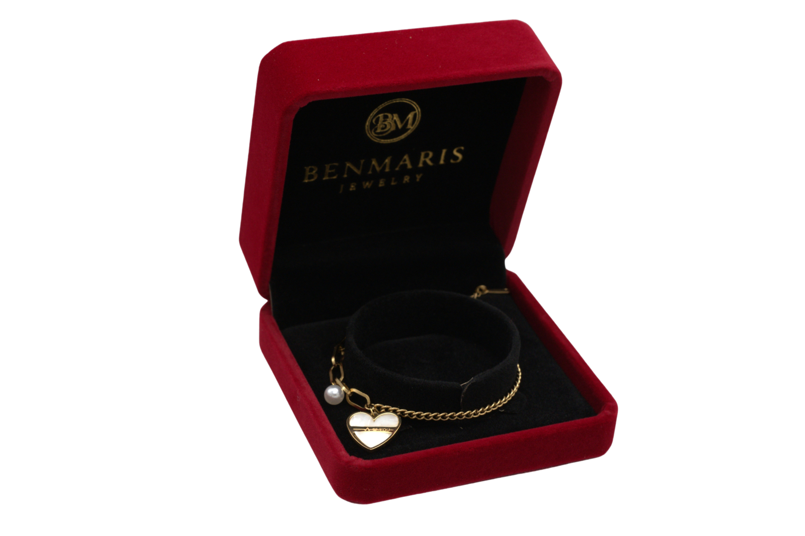 Brățară fină din oțel inoxidabil placată auriu, cu design asimetric alcătuit din zale de diferite dimensiuni, decorată cu un pandantiv în formă de inimă și o perlă elegantă. Accesoriul emană feminitate și rafinament, fiind potrivit pentru orice ținută – de la casual la elegant. Materialul rezistent asigură durabilitate și păstrarea culorii în timp. Brățara este livrată în cutia originală Benmaris Jewelry, adăugând o notă luxoasă și perfectă pentru un cadou deosebit.