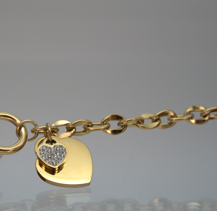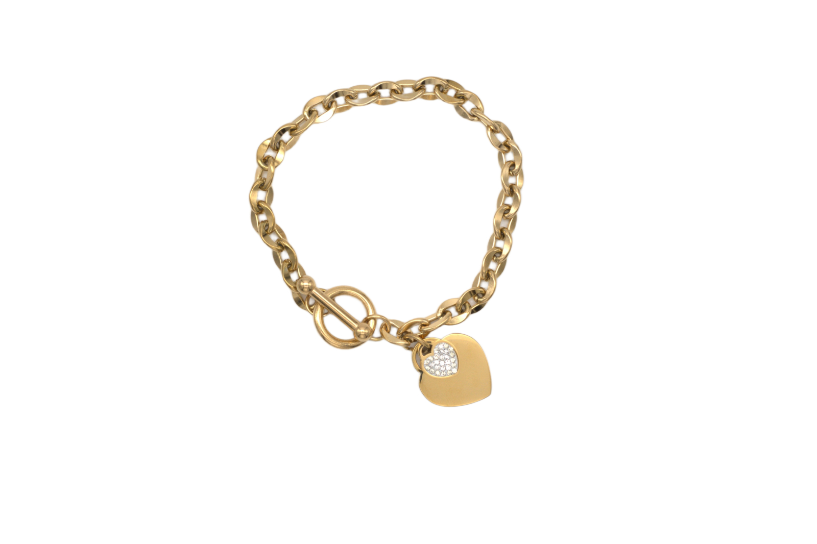Brățară elegantă din oțel inoxidabil placată auriu, cu zale groase și pandantiv în formă de inimă decorat cu cristale strălucitoare. Sistemul de închidere tip T-bar adaugă un plus de rafinament și face brățara ușor de purtat. Designul său modern, dar în același timp romantic, o transformă într-un accesoriu versatil – perfect atât pentru ținute de zi, cât și pentru ocazii speciale. Fabricată din materiale de înaltă calitate, rezistente la oxidare, brățara își păstrează strălucirea și finisajul impecabil în timp. Produsul este livrat în cutia originală Benmaris Jewelry, ideală pentru un cadou elegant și plin de semnificație.