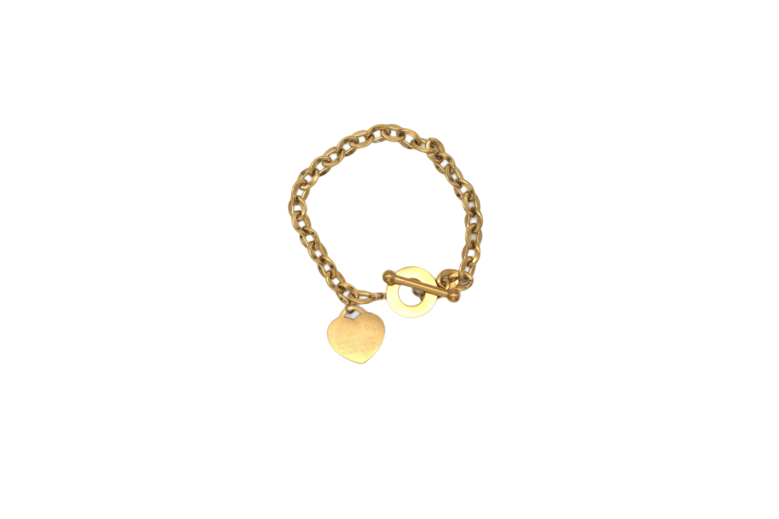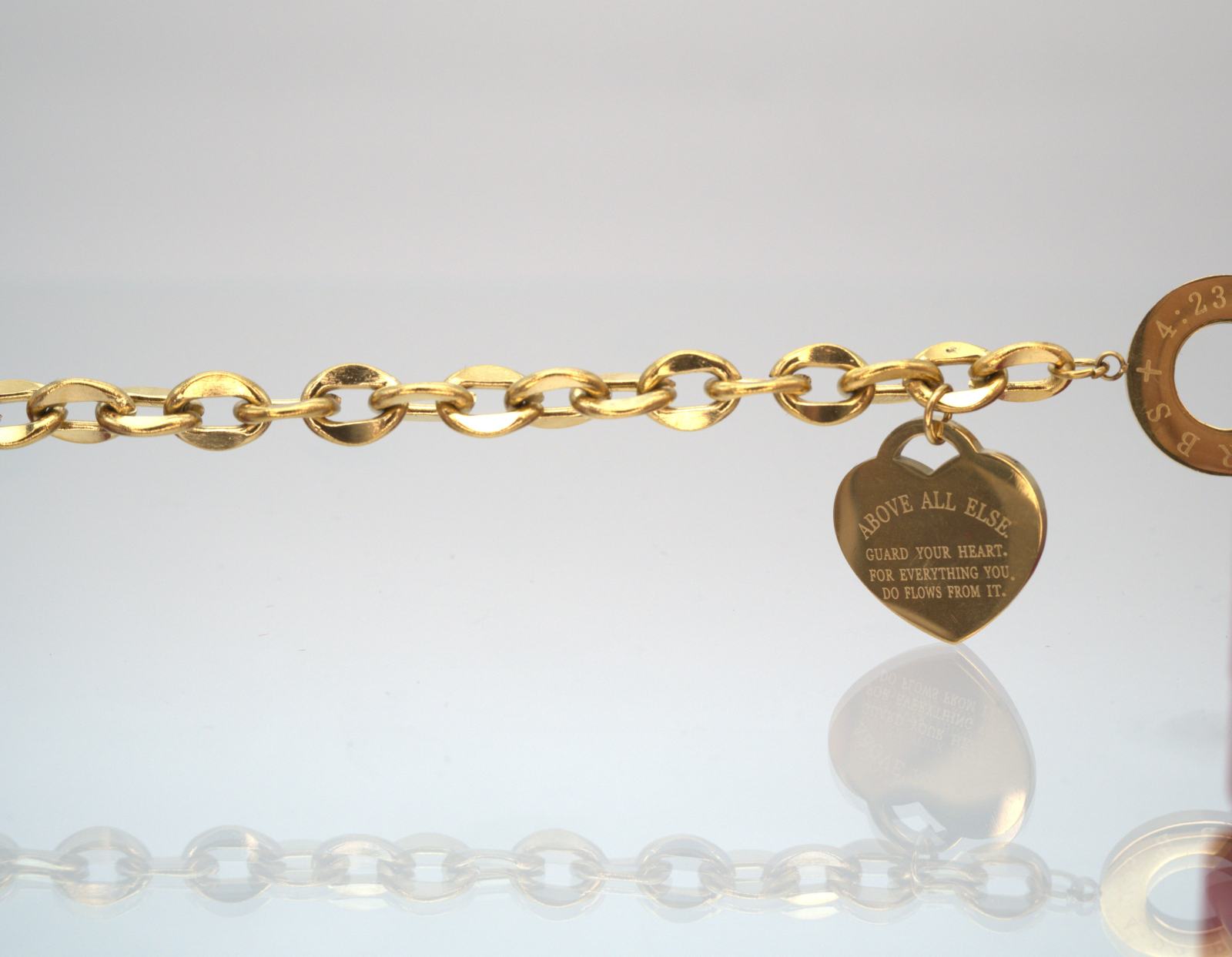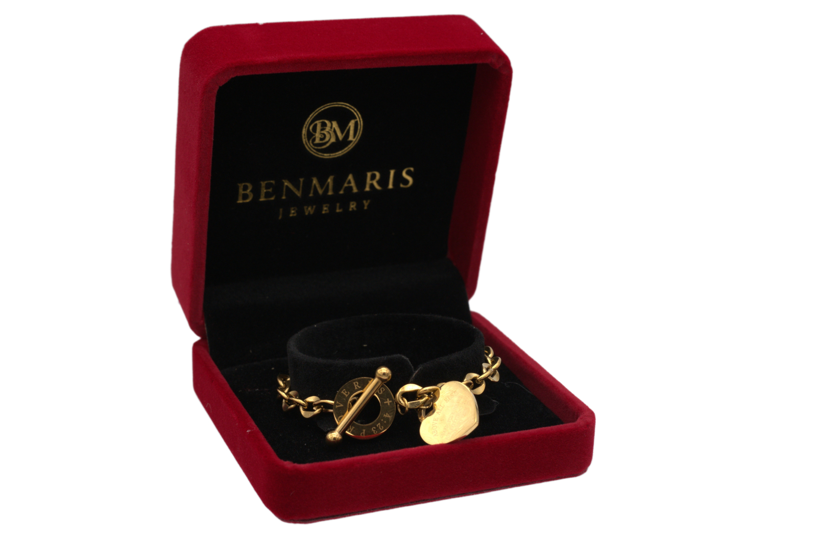 Brățară statement din oțel inoxidabil, placată auriu, cu zale groase și detalii elegante. Accesoriul central este format dintr-un pandantiv în formă de inimă inscripționat cu mesajul „Above all else, guard your heart, for everything you do flows from it” și un inel gravat cu simboluri decorative. Sistemul de închidere tip T-bar conferă brățării un aer sofisticat și modern. Realizată din materiale premium, brățara oferă rezistență la uzură și o strălucire de durată. Produsul este livrat în cutia originală Benmaris Jewelry, ideală pentru un cadou elegant și cu semnificație.