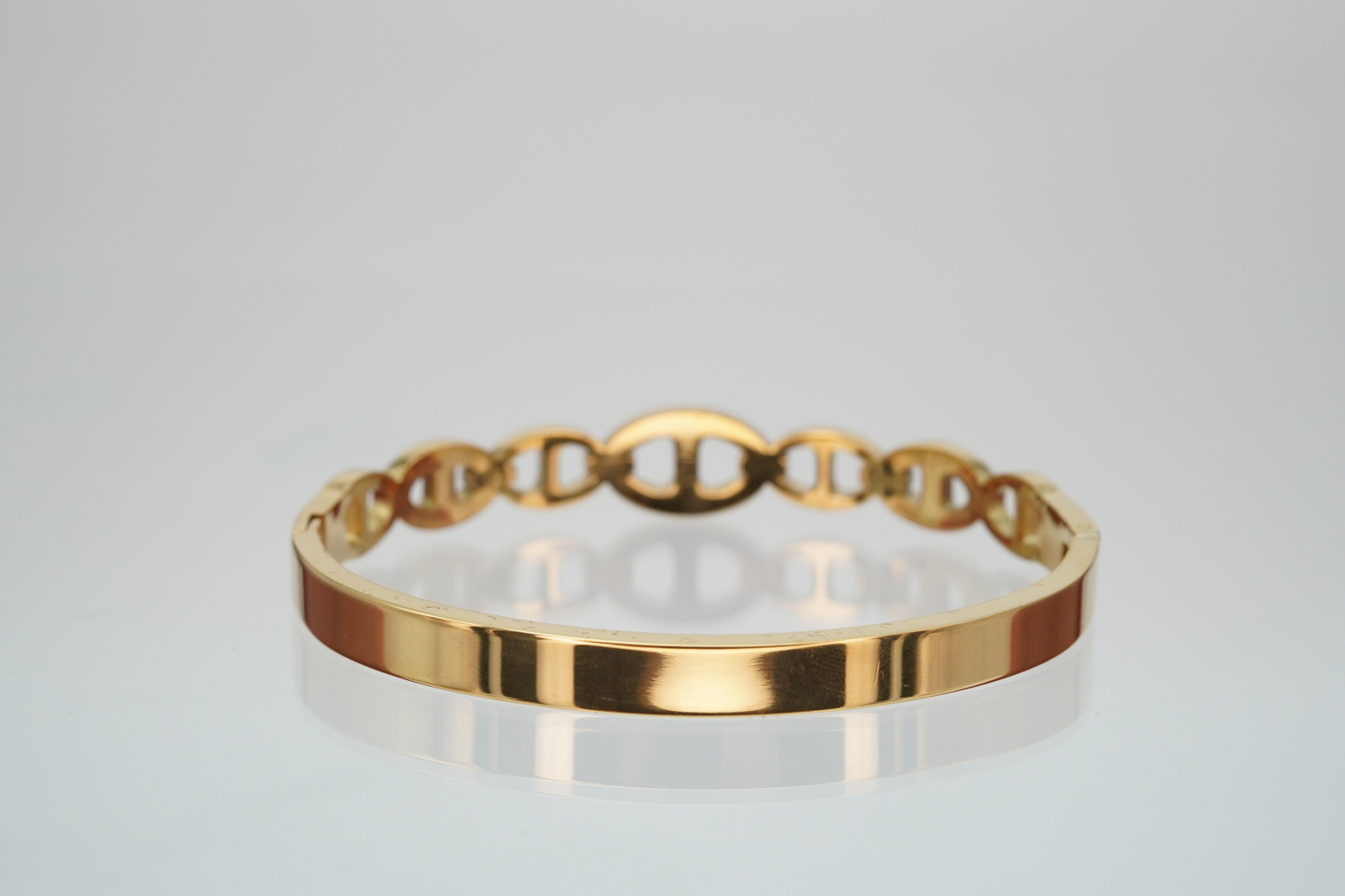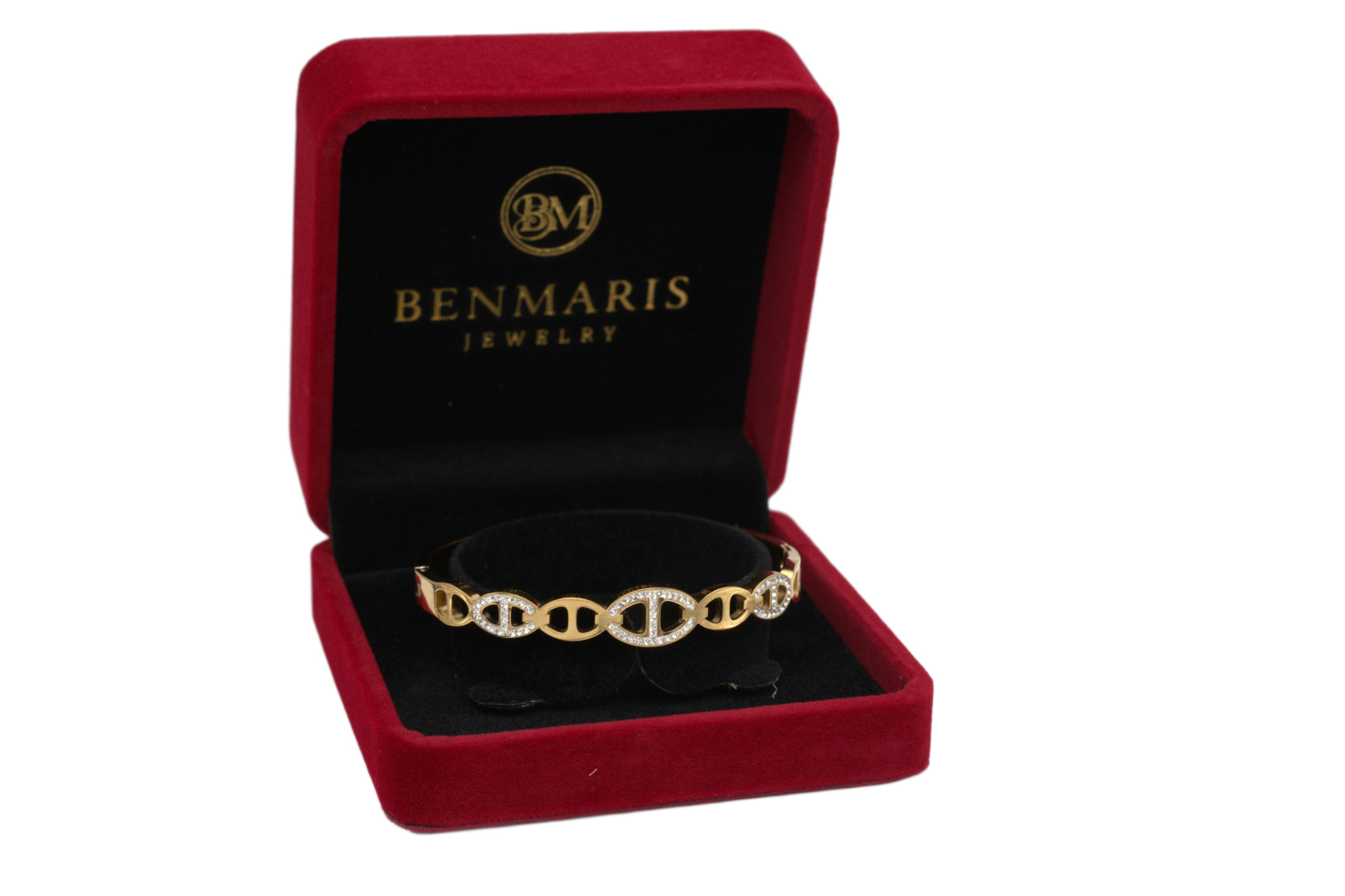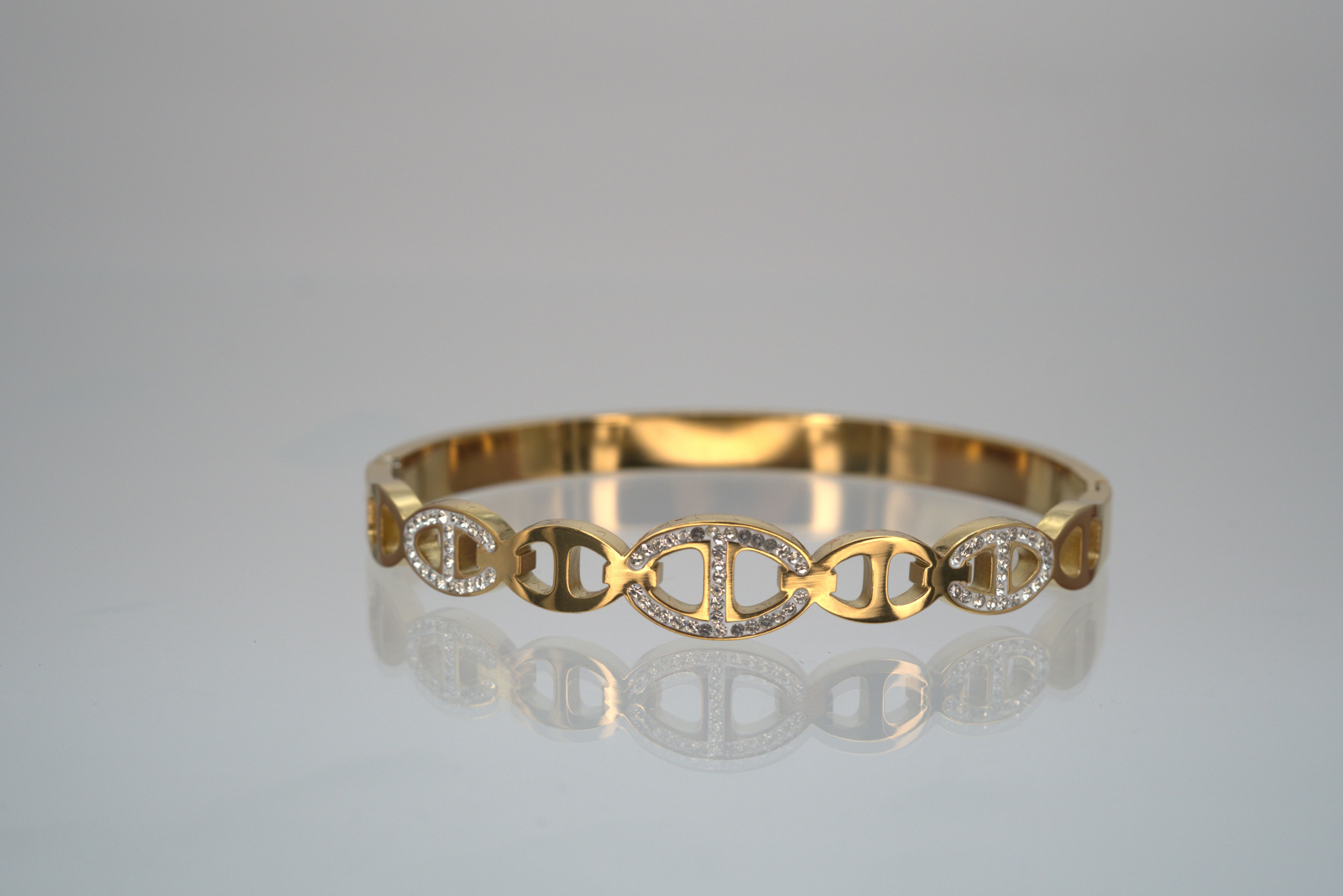 Această brățară rafinată din oțel inoxidabil, placată cu un finisaj lucios auriu, se remarcă prin eleganța și echilibrul designului său. Elementele ovale interconectate sunt decorate parțial cu cristale strălucitoare, oferind un aspect sofisticat și modern. Construcția solidă din oțel inoxidabil asigură durabilitate și rezistență la uzură, în timp ce detaliile atent lucrate adaugă o notă de lux discret. Brățara vine însoțită de cutia sa originală Benmaris Jewelry, perfectă pentru un cadou rafinat sau pentru păstrarea în siguranță a bijuteriei.