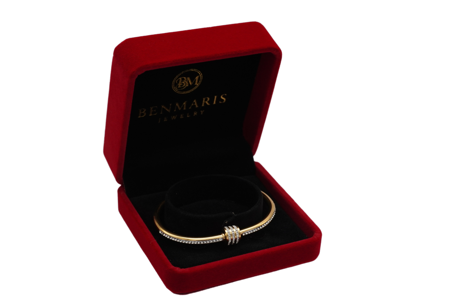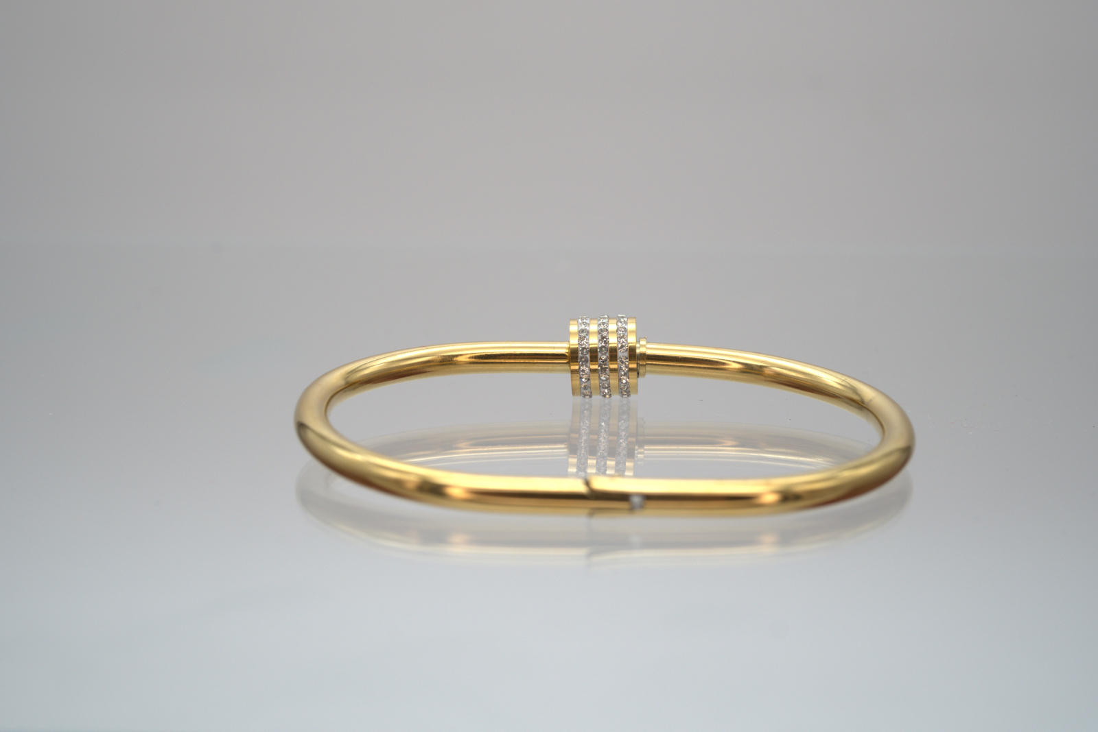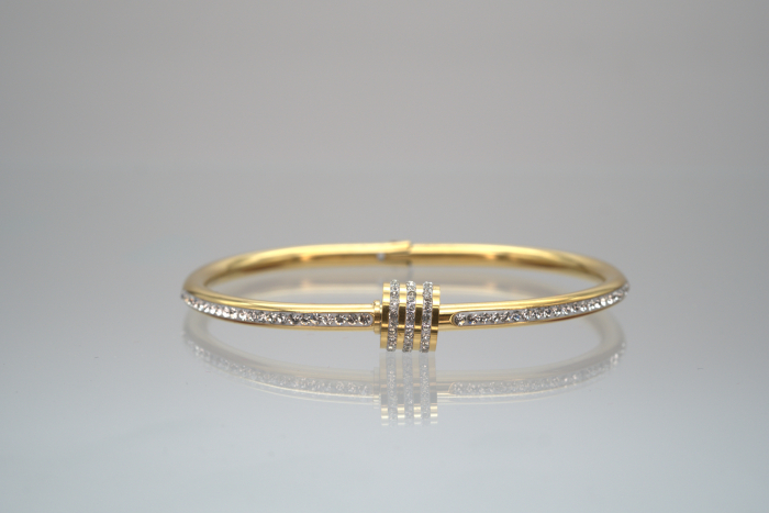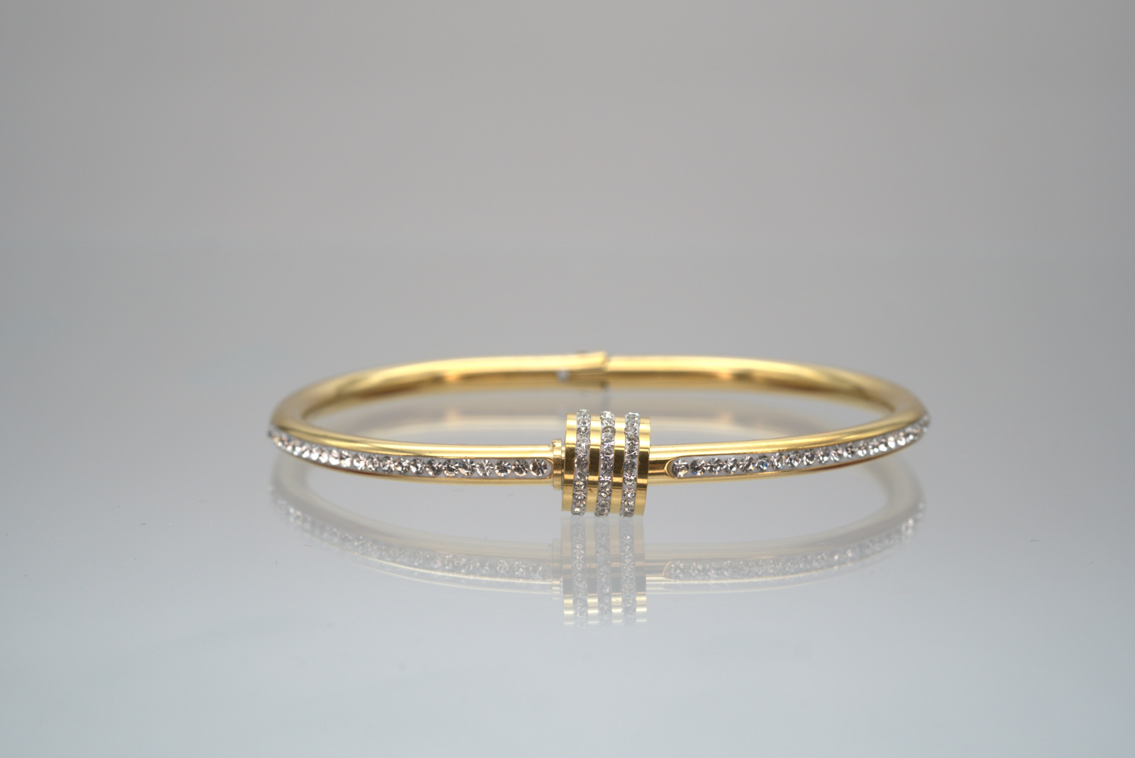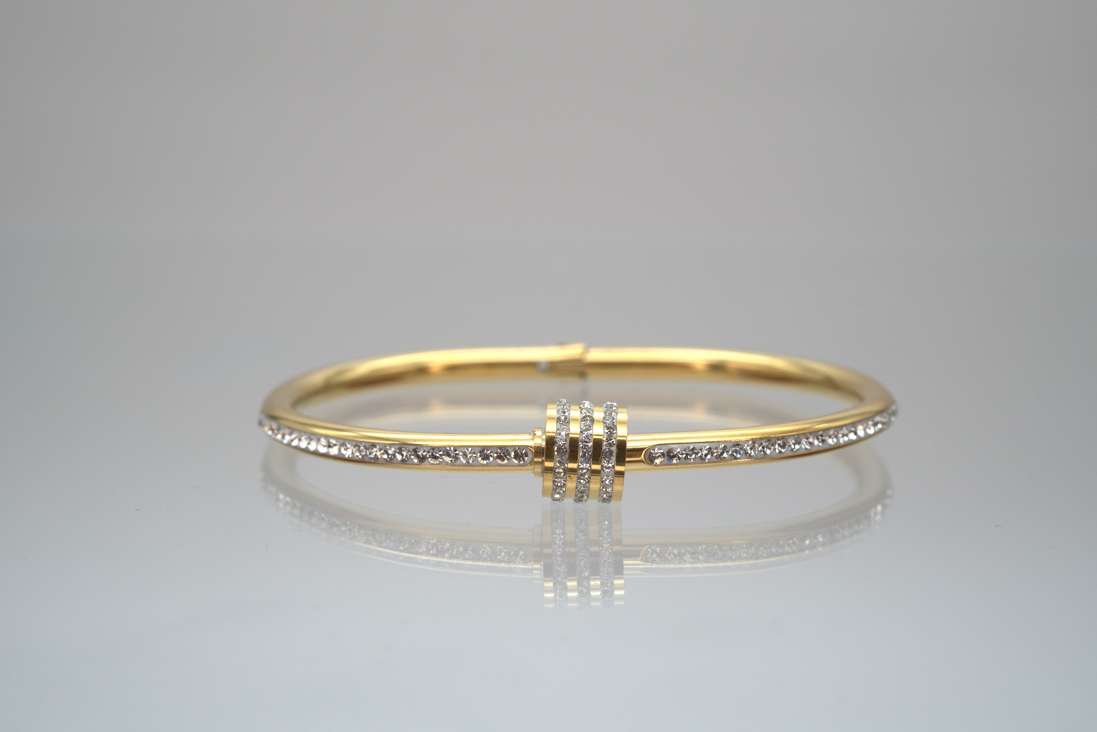 Această brățară elegantă din oțel inoxidabil, finisată într-o nuanță caldă de auriu, emană rafinament și echilibru. Designul său minimalist este accentuat de două rânduri fine de cristale care adaugă o strălucire subtilă, completate perfect de elementul central triplu, simbol al eleganței moderne. Confecționată din oțel inoxidabil de înaltă calitate, brățara își menține luciul și rezistența în timp, fiind potrivită pentru purtare zilnică sau pentru evenimente speciale. Produsul este livrat împreună cu cutia sa originală Benmaris Jewelry, ideală pentru un cadou sofisticat și memorabil.
