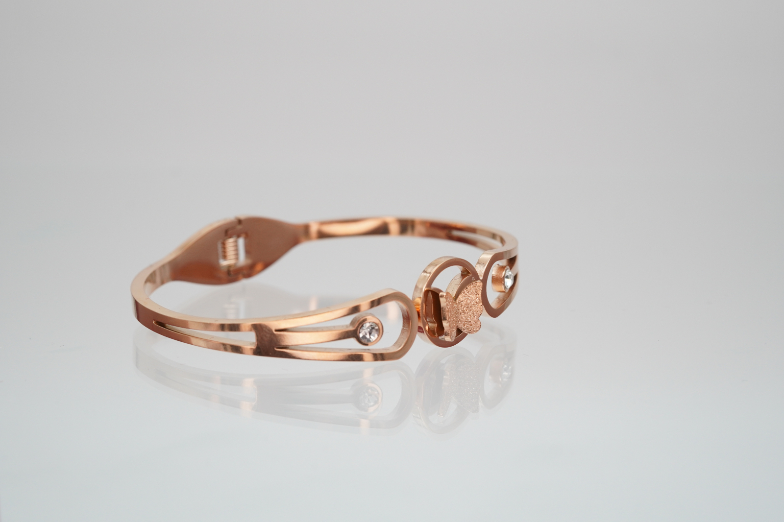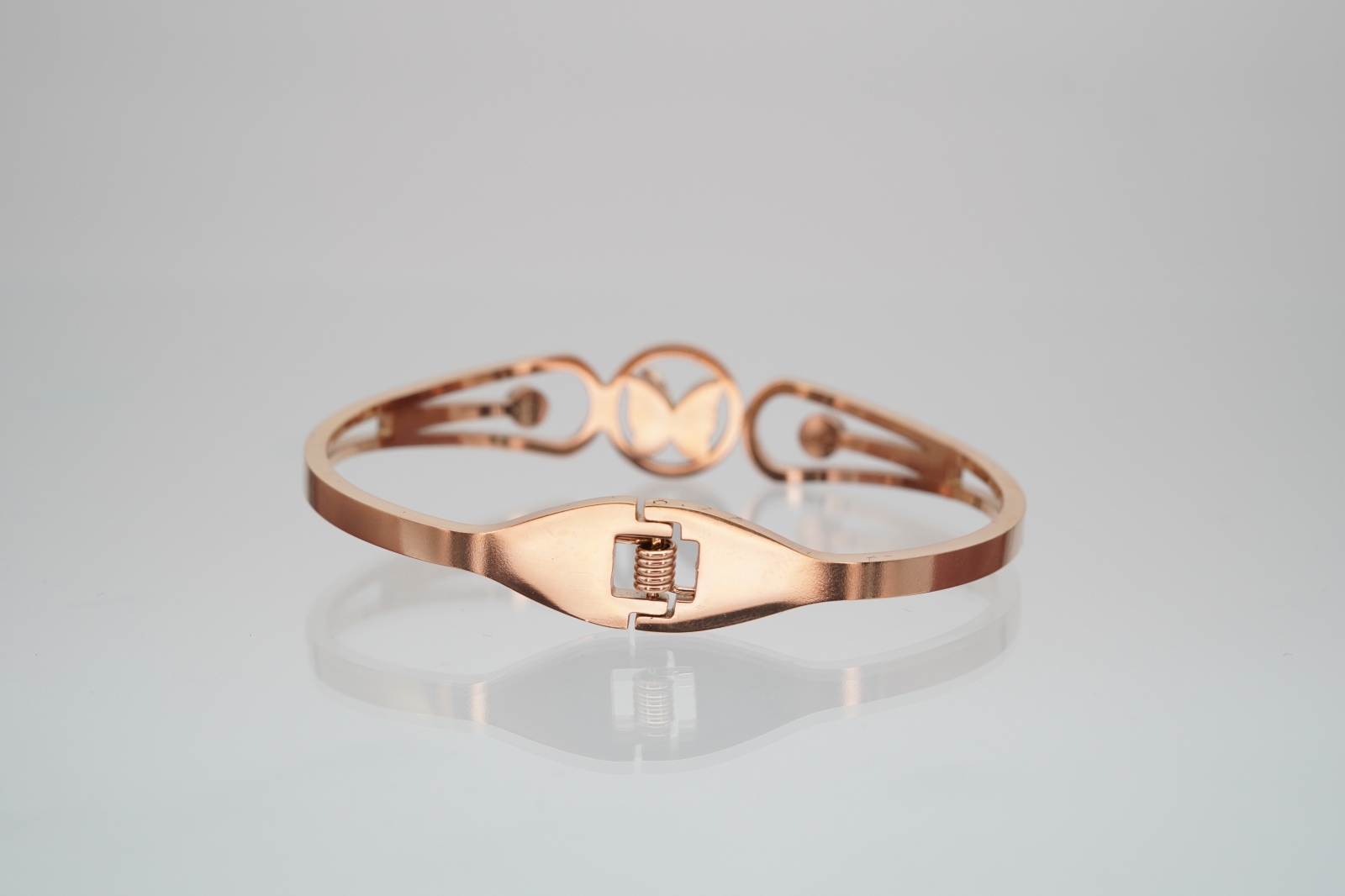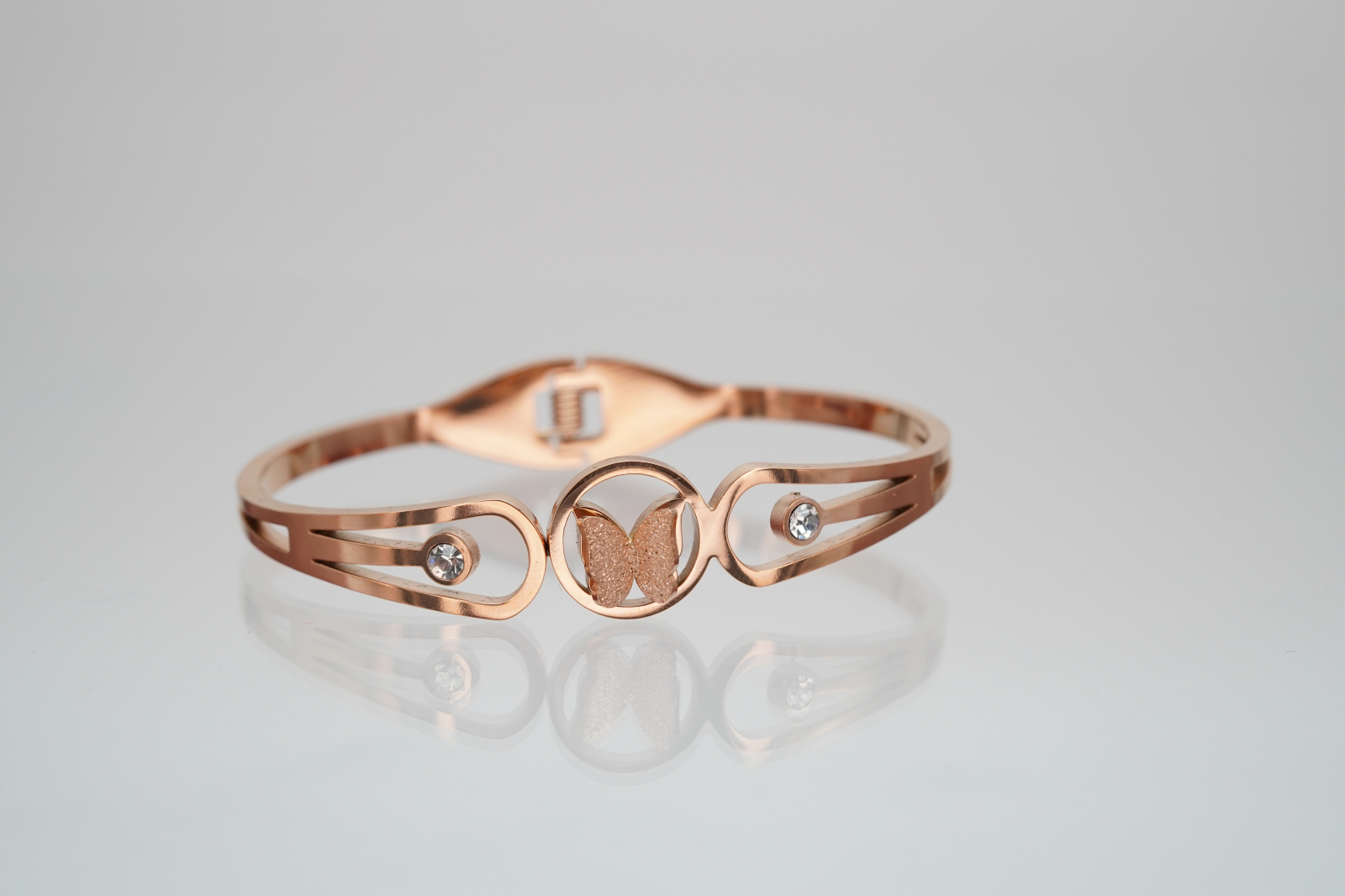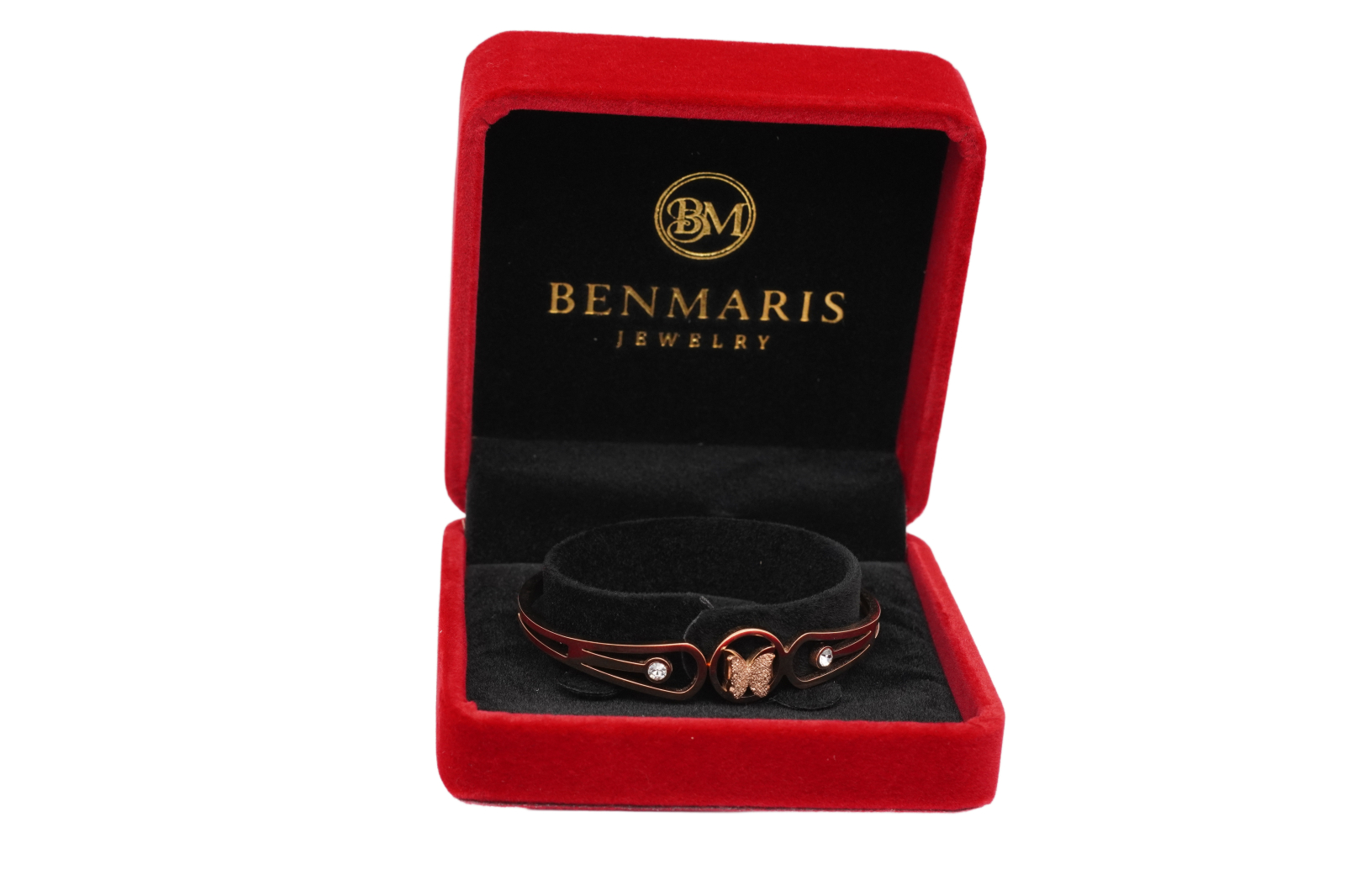 Brățară fină din oțel inoxidabil placată cu aur roz, cu un design delicat ce evidențiază un fluture central — simbol al feminității, libertății și transformării. Pe laterale, două cristale strălucitoare adaugă un plus de rafinament și eleganță, creând un echilibru perfect între finețe și modernitate. Datorită finisajului lucios și rezistenței la uzură, această bijuterie este ideală pentru purtare zilnică sau ocazii speciale. Livrată într-o cutie premium Benmaris Jewelry, perfectă pentru cadou.