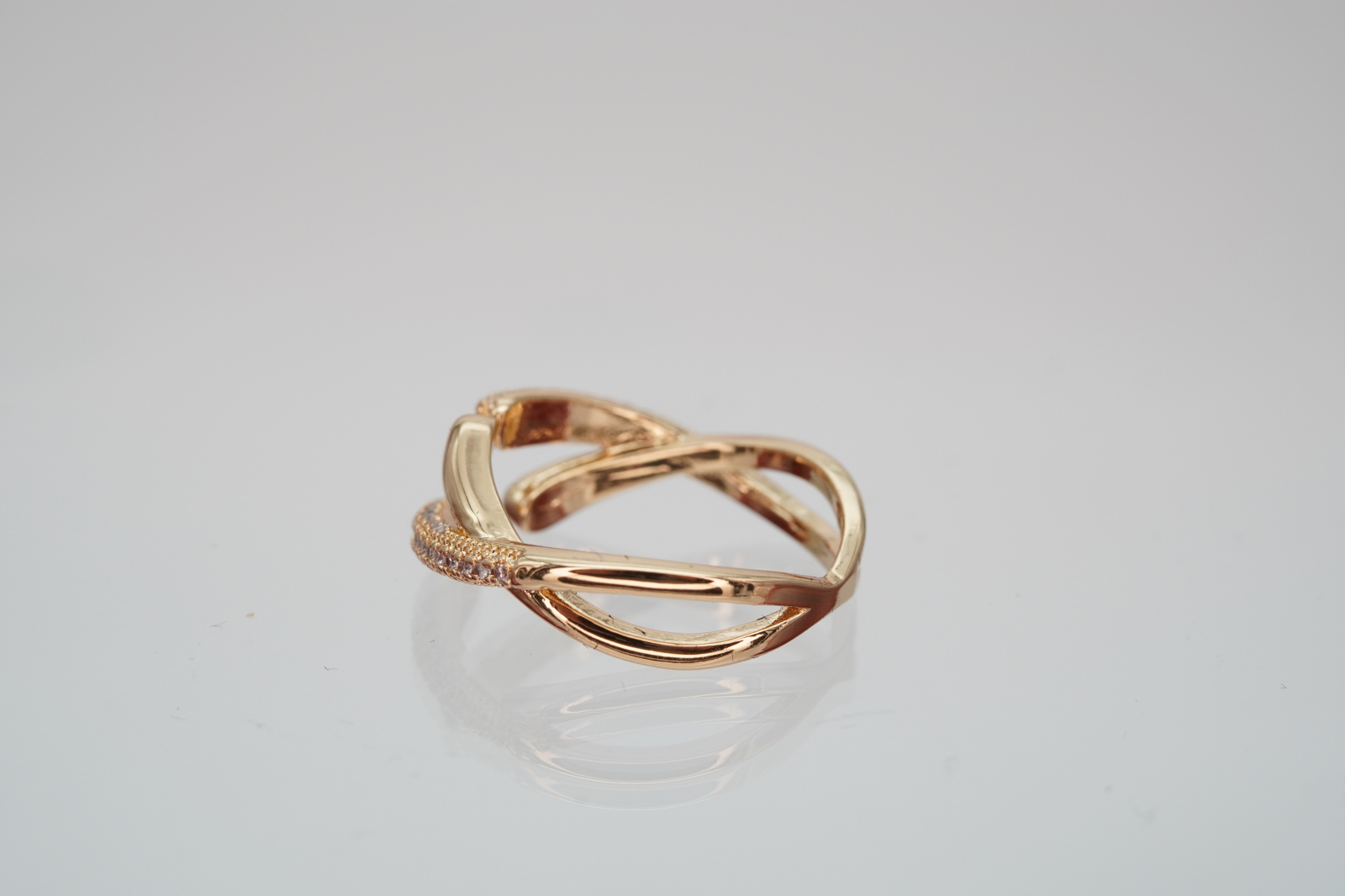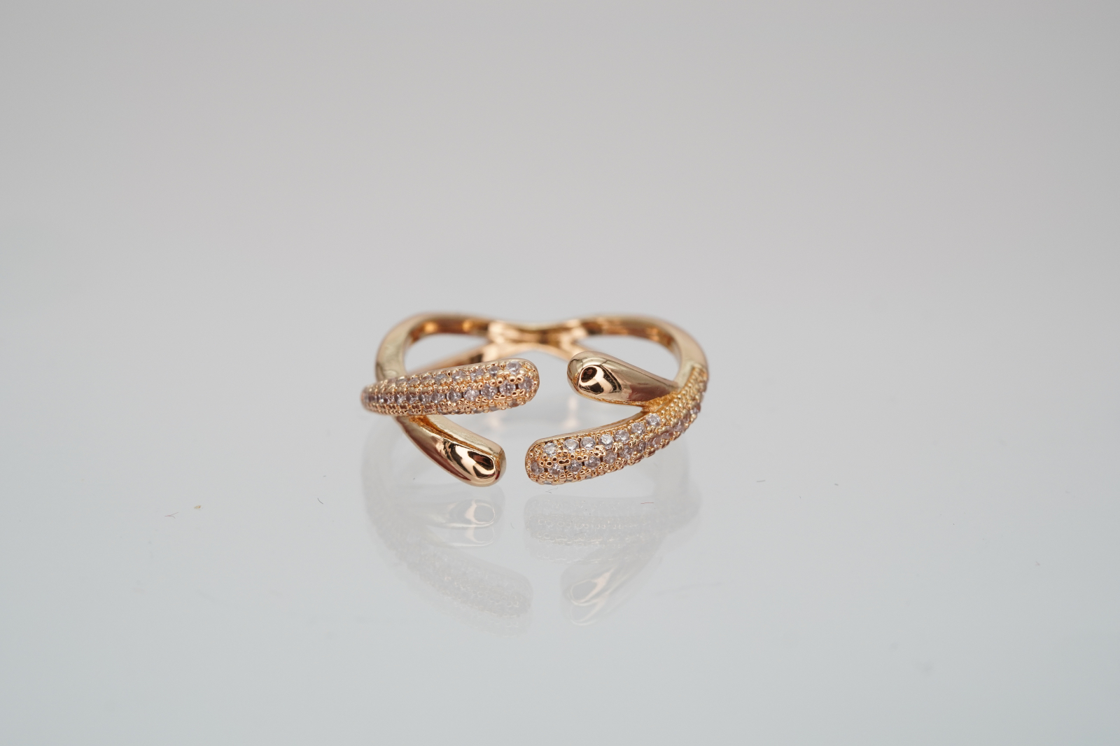 Acest inel elegant este realizat din oțel inoxidabil de înaltă calitate, finisat într-o nuanță aurie caldă. Designul său modern este definit de două brațe subțiri, asimetrice, care se împletesc într-o linie fluidă și feminină – unul cu suprafață lucioasă, minimalistă, iar celălalt decorat cu microcristale strălucitoare, pentru un efect spectaculos de lumină. Forma sa lejer deschisă conferă un plus de confort și versatilitate, potrivindu-se perfect atât ținutelor de zi, cât și celor de seară. Produsul este livrat însoțit de cutia originală Benmaris Jewelry, din catifea roșie, ideală pentru depozitare în siguranță sau pentru a fi oferit drept cadou într-o prezentare premium.