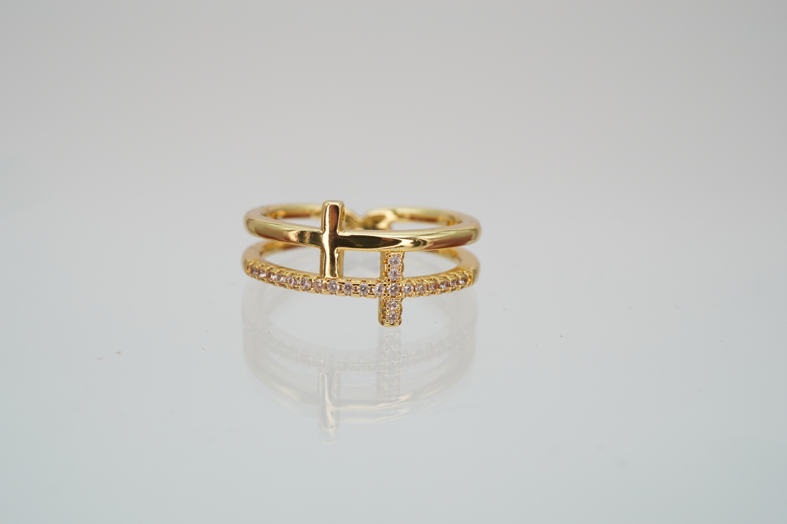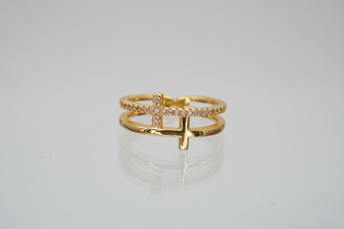 Acest inel Benmaris are un design deosebit, format din două benzi paralele, unite prin două cruci dispuse frontal. Prima cruce este simplă, elegantă, cu finisaj lucios, iar a doua este complet acoperită cu zirconii transparente, amplasate cu precizie pentru un plus de strălucire. Placarea în aur galben conferă un aspect luxuriant, iar forma deschisă a celor două benzi îl face confortabil și atrăgător.