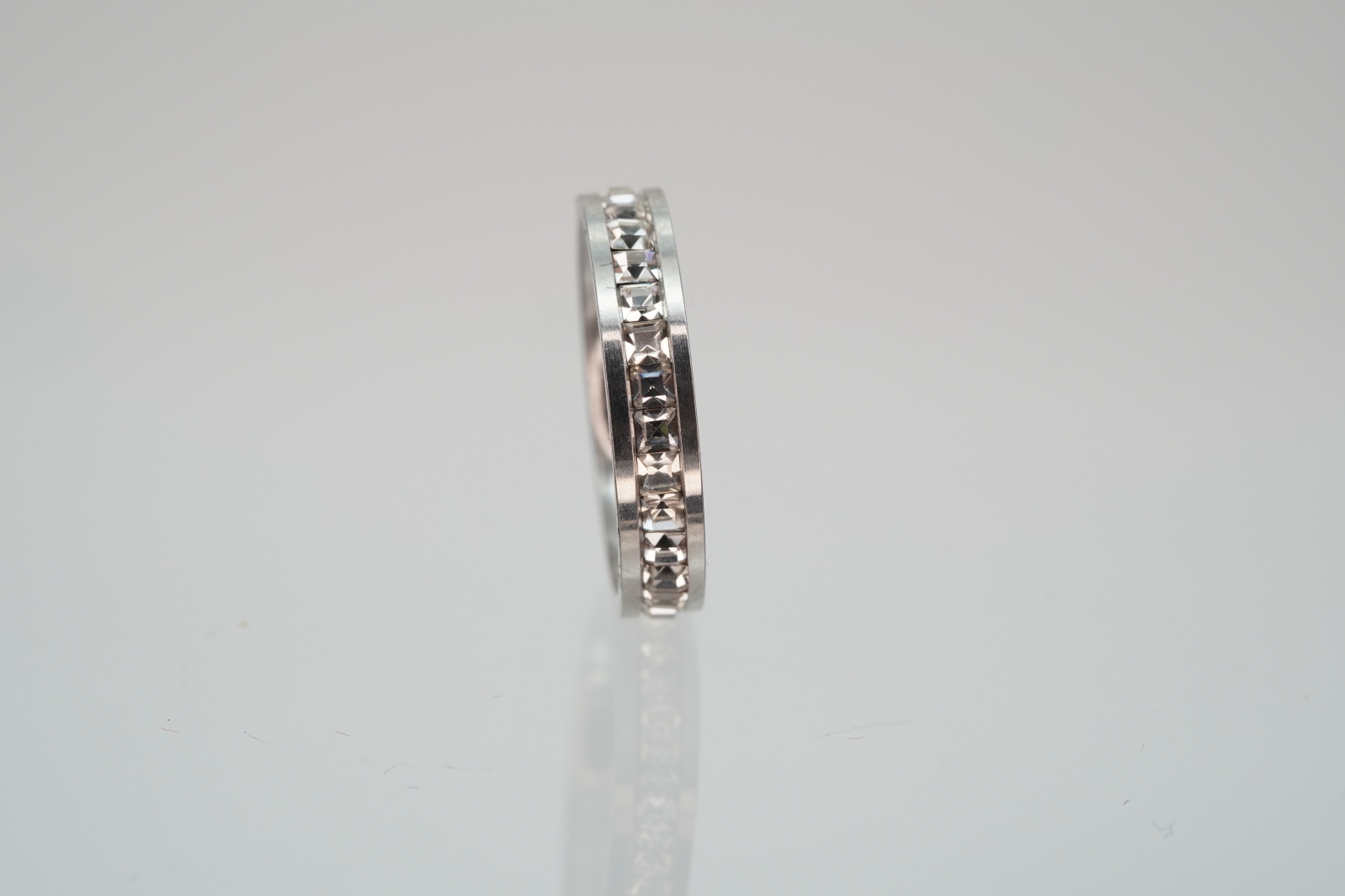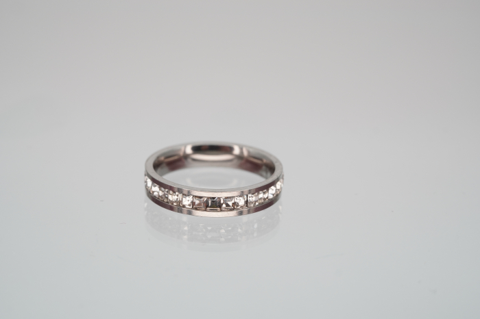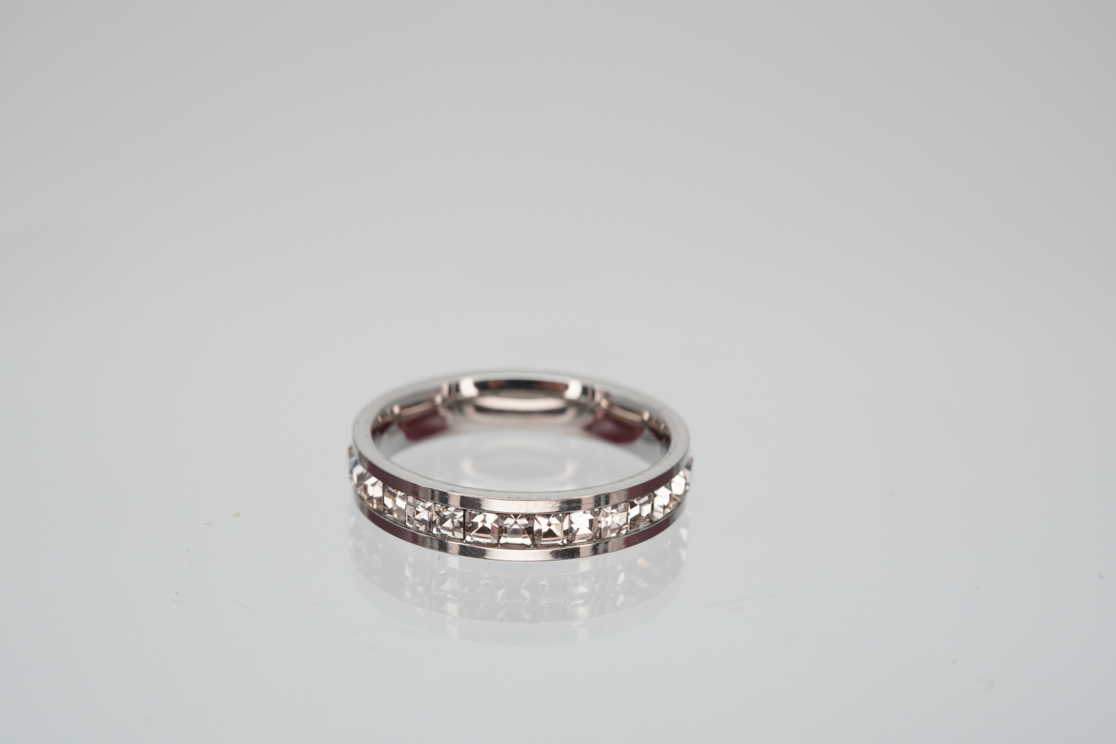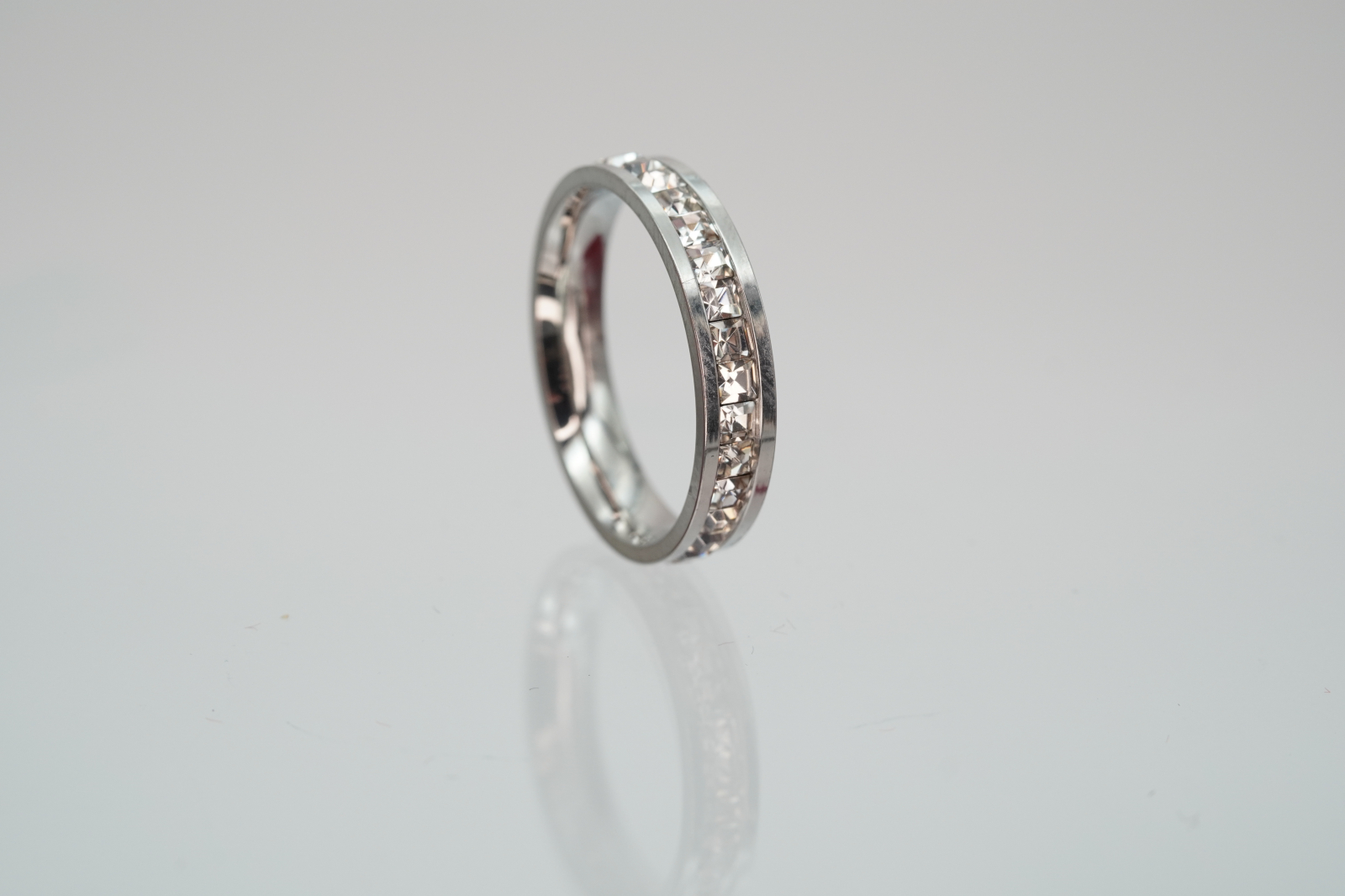 Inel clasic din oțel inoxidabil, finisat impecabil și decorat cu o serie continuă de cristale fine, atent montate pentru un efect de strălucire rafinată. Designul său minimalist, dar elegant, îl face alegerea ideală pentru a fi purtat zilnic sau în ocazii speciale, simbolizând rafinament și echilibru. Datorită rezistenței materialului, păstrează strălucirea și forma în timp. Este livrat într-o cutie elegantă Benmaris Jewelry, perfectă pentru a fi oferit cadou.