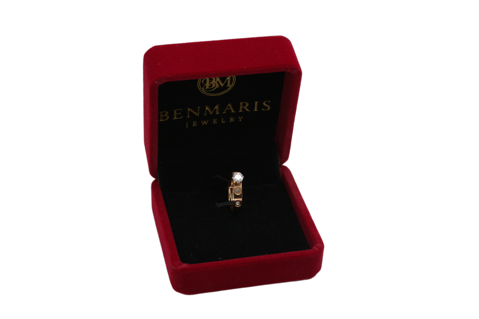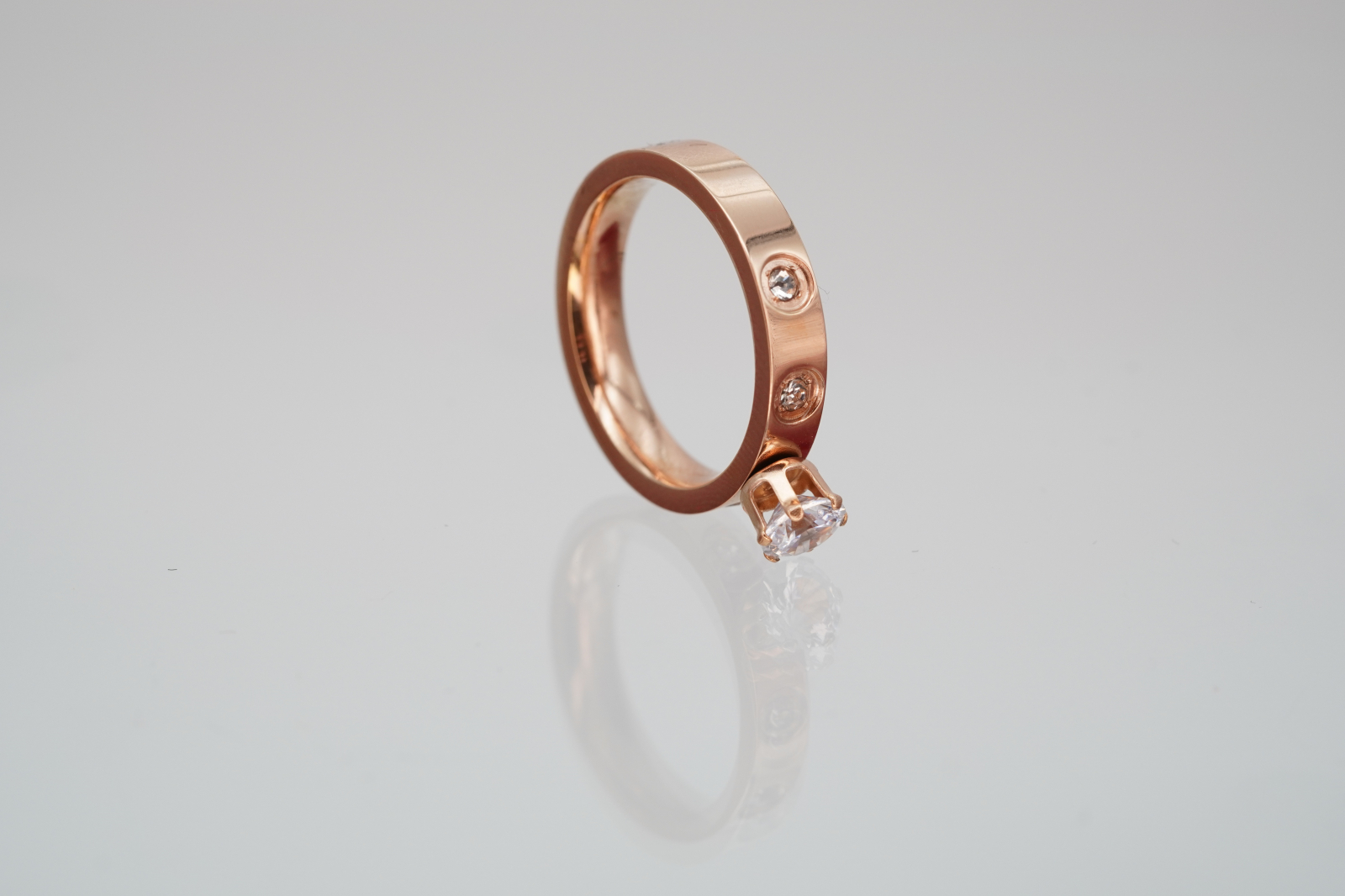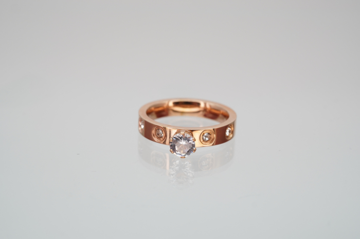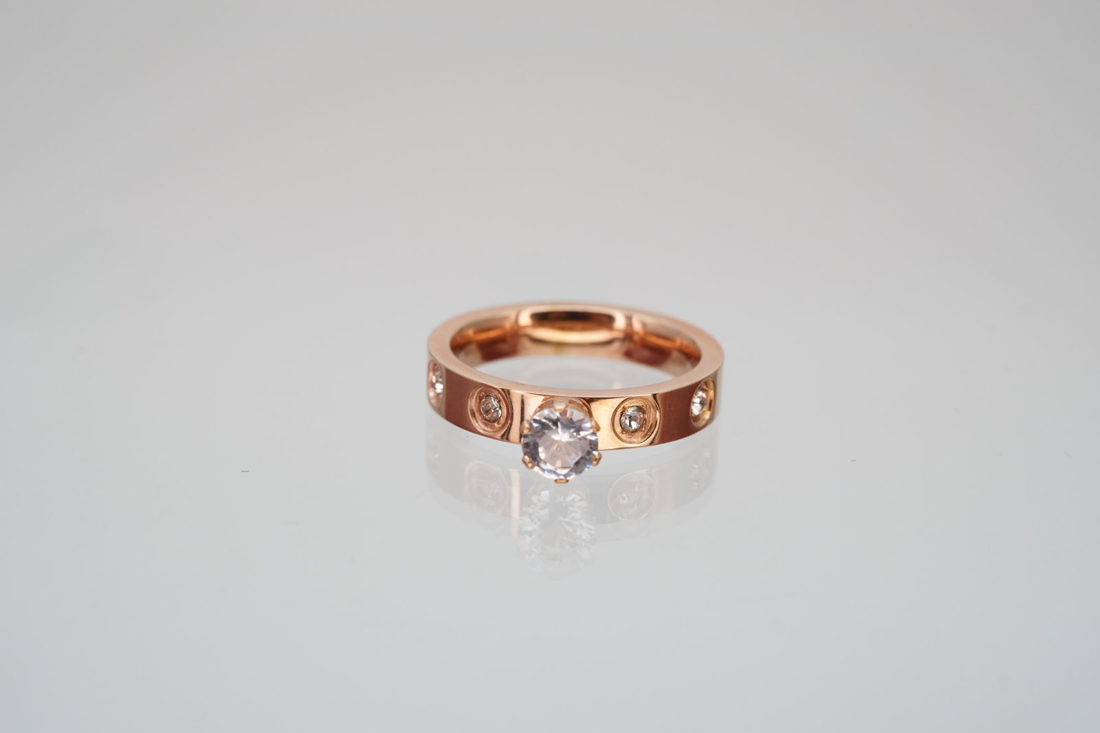 Acest inel Benmaris este realizat din oțel inoxidabil placat cu aur roz, având un design modern și atrăgător. În partea centrală se află o piatră zirconia mare, tăietură rotundă, montată în prindere clasică cu gheare, ce oferă un efect vizual puternic. Banda inelului este decorată cu pietricele zirconia mici, fiecare fixată în monturi rotunde, pentru un plus de lumină și eleganță. Modelul nu conține diamante sau alte pietre prețioase naturale. Produsul vine însoțit de cutia originală Benmaris, ideală pentru ambalare de cadou sau păstrarea bijuteriei în condiții excelente.