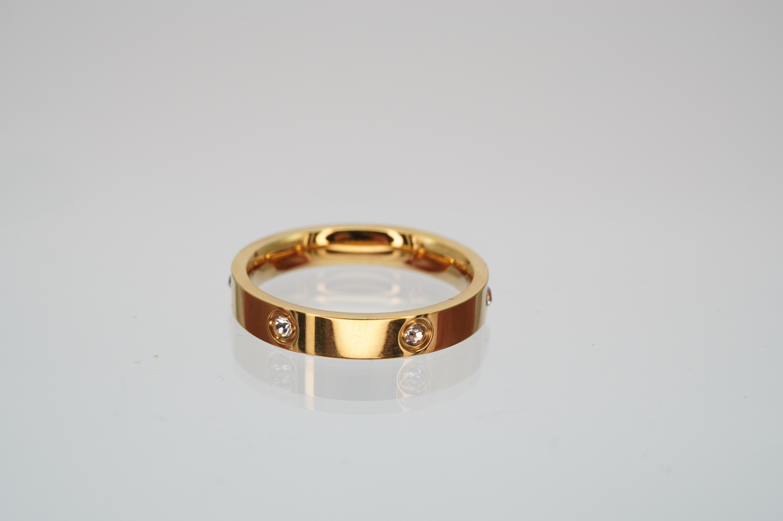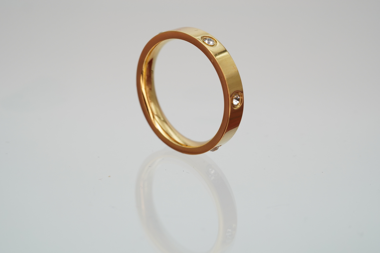 Inel Benmaris realizat din oțel inoxidabil placat cu aur galben, având un design clasic și curat, cu suprafață complet lucioasă. Pe circumferință sunt integrate mai multe pietricele zirconia transparente, fiecare montată individual în casete rotunde, oferind o strălucire subtilă și constantă. Produsul vine însoțit de cutia originală Benmaris, ideală pentru cadou, prezentare elegantă sau depozitare în siguranță.