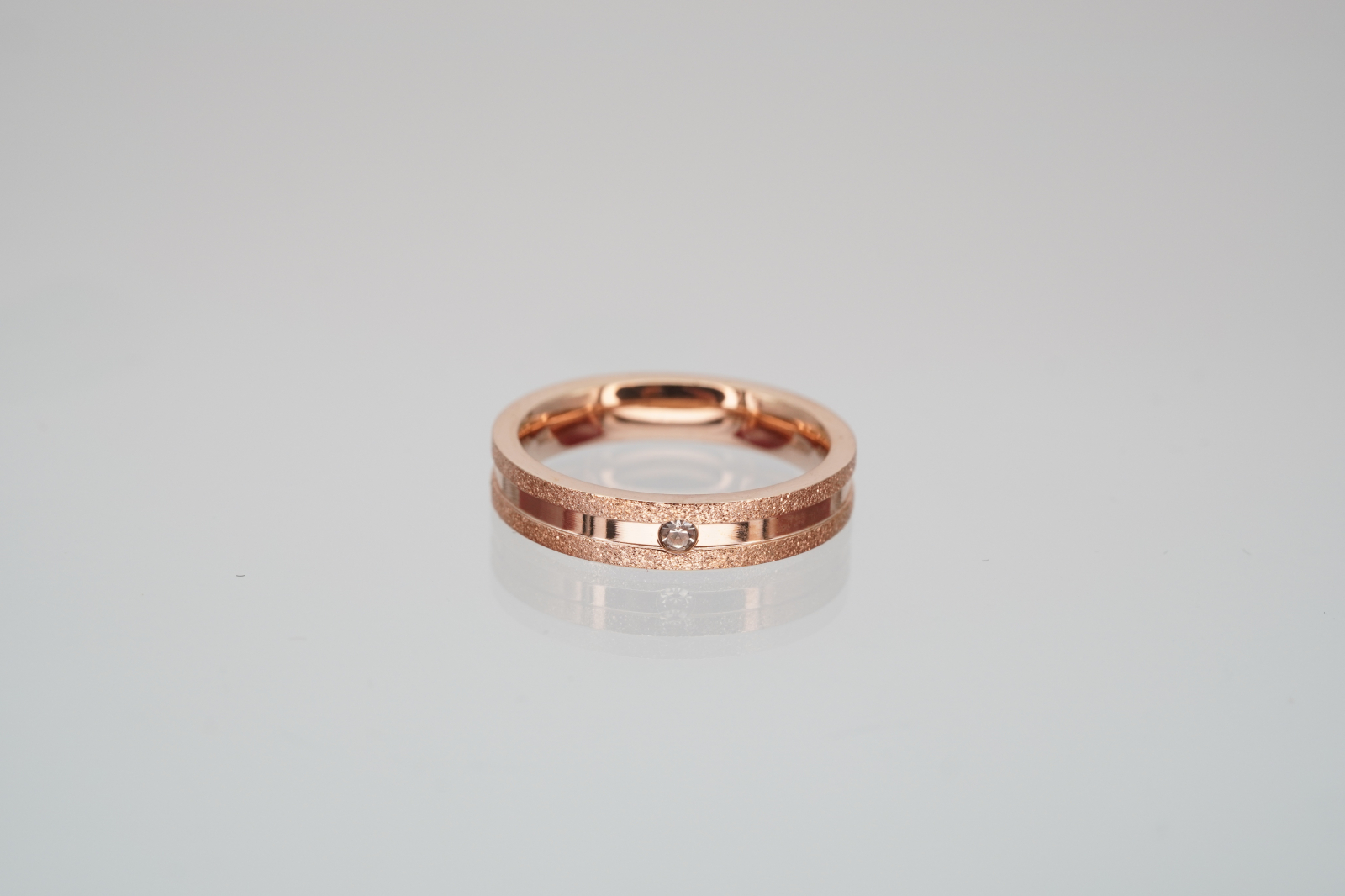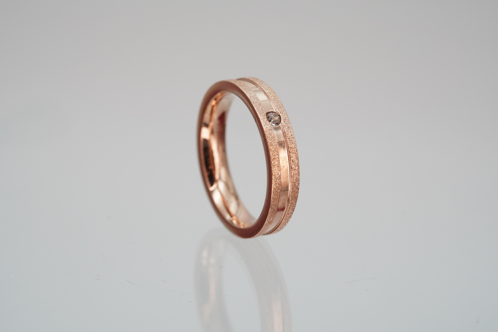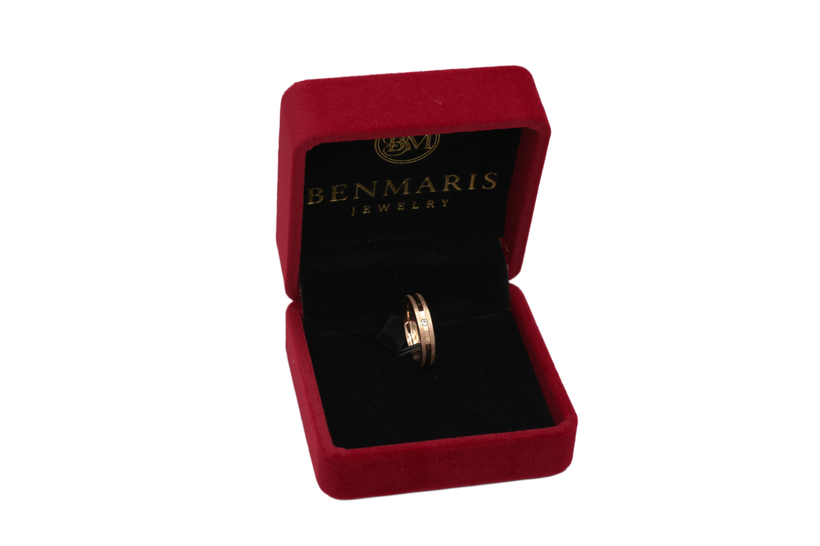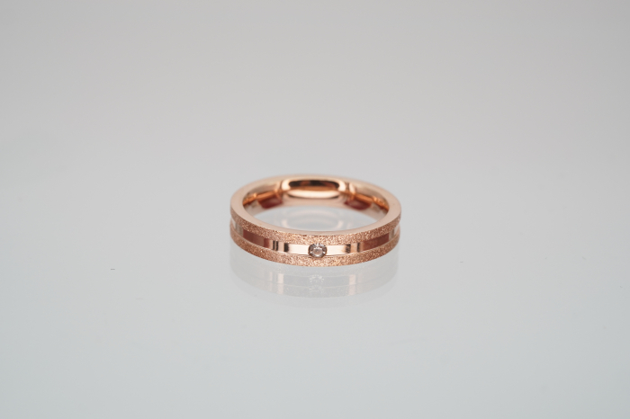 Inel elegant Benmaris realizat din oțel placat cu aur roz, compus din două benzi: una netedă și lucioasă, cealaltă cu textură sablată pentru un contrast vizual rafinat. În partea centrală este montată o pietricică zirconia, oferind un plus de strălucire. Produsul vine însoțit de cutia originală Benmaris, ideală pentru cadou sau depozitare.